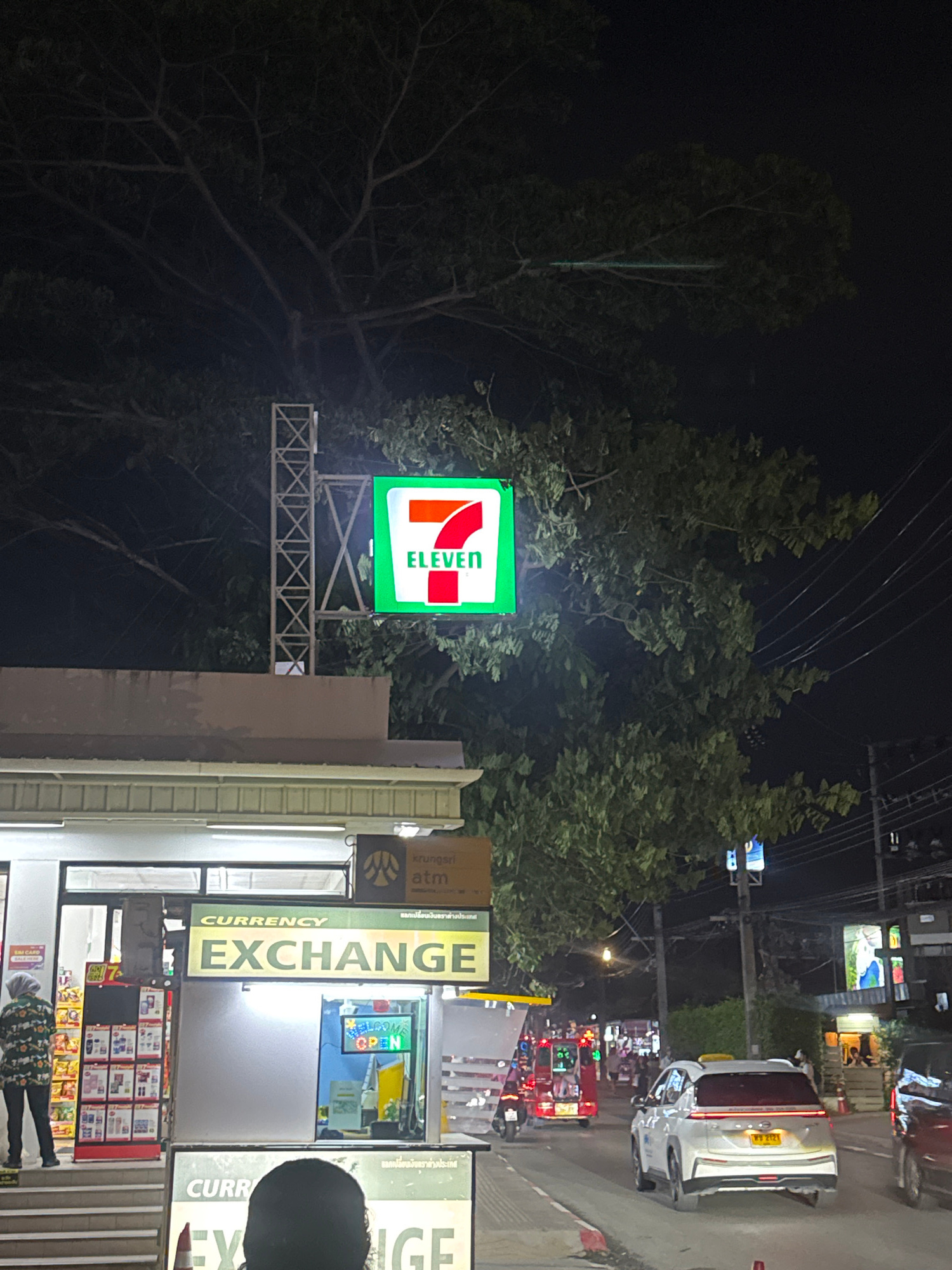 Here is a description of the image: The image shows an intersection in Patong, Thailand, at night. There is a 7-Eleven convenience store on the left, with its illuminated green sign visible above a K…read more