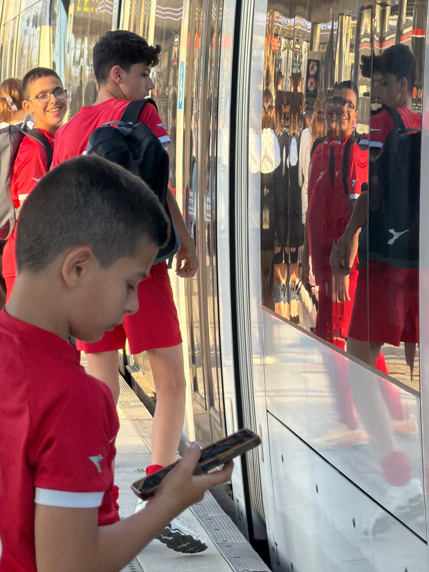 The image depicts three boys in Bat Yam, Israel. All are wearing red shirts with white trim and dark shorts. One boy is holding a smartphone, seemingly taking a picture. The boys are standing under a…read more