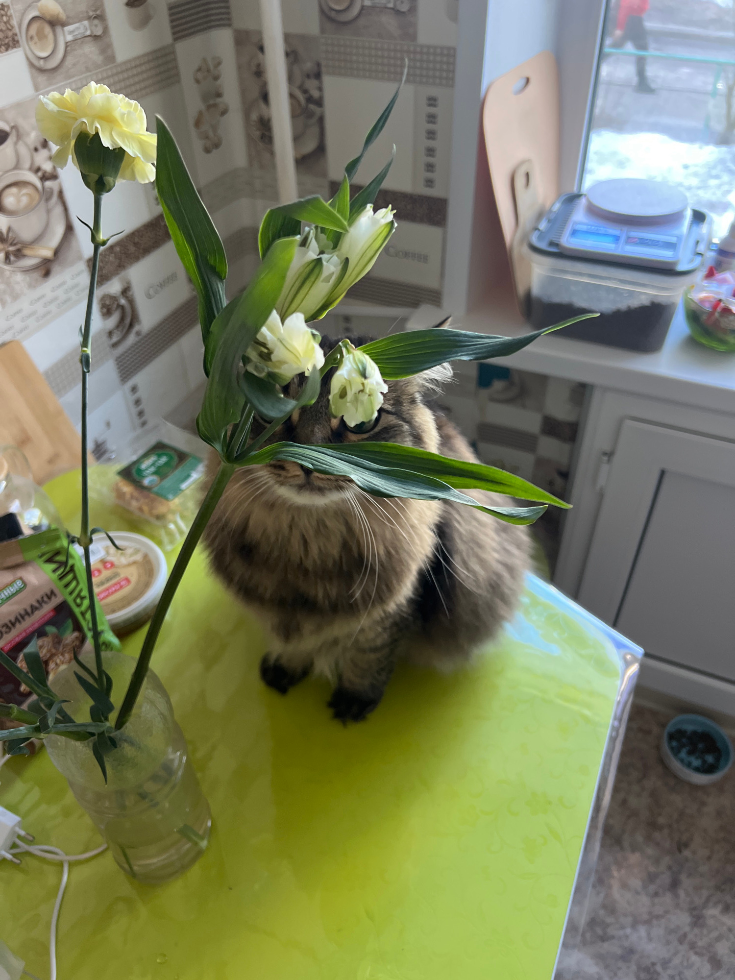 A domestic, brown and black tabby cat is lying on a table with a light green surface in an indoor setting. The cat is partially obscured by a vase filled with white and yellow flowers, some leaves of…read more