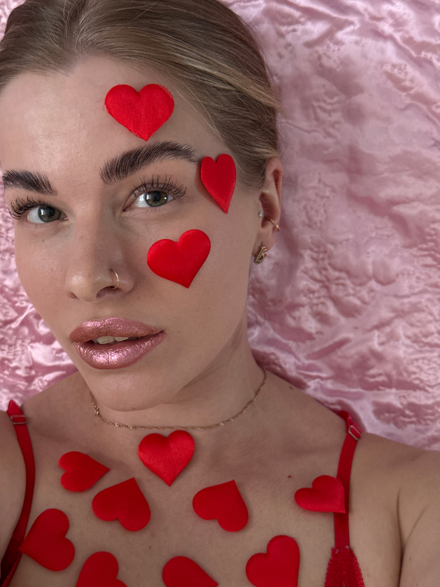 The image depicts a person with fair skin lying on a pink, textured fabric. The person has blonde hair, long eyelashes, and is wearing a red bra. Red heart-shaped decorations are scattered across thei…read more