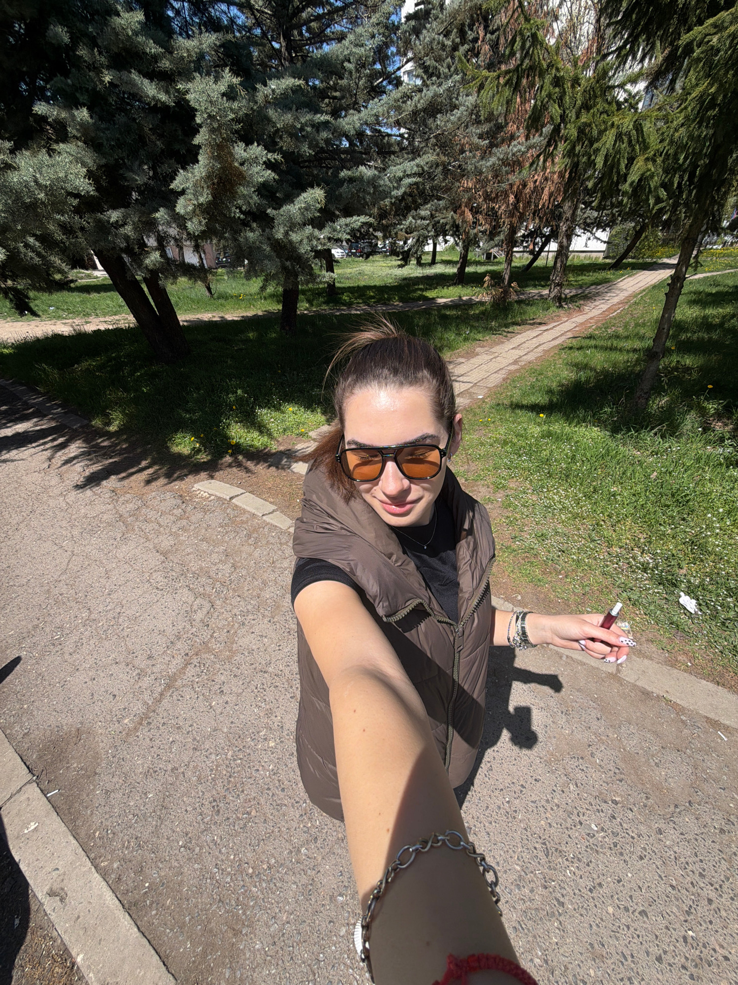 The image is a selfie taken outdoors, featuring a woman from the chest up, looking down at the camera held at arm's length. She is wearing orange-tinted sunglasses, a dark brown sleeveless puffer vest…read more