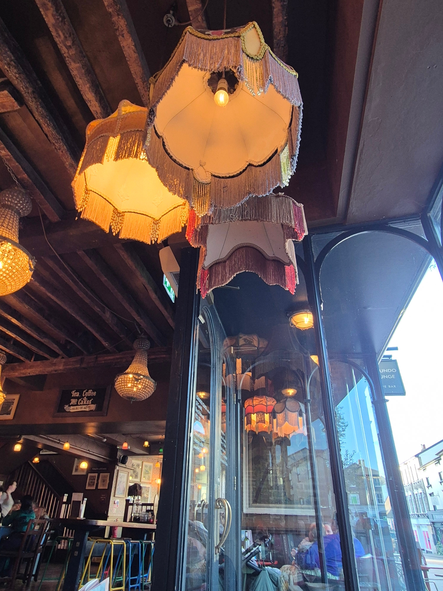 The image shows the interior of a café or restaurant in West Suffolk, United Kingdom, viewed from a slightly upward angle. The ceiling appears to be made of dark wood beams, from which a series of orn…read more