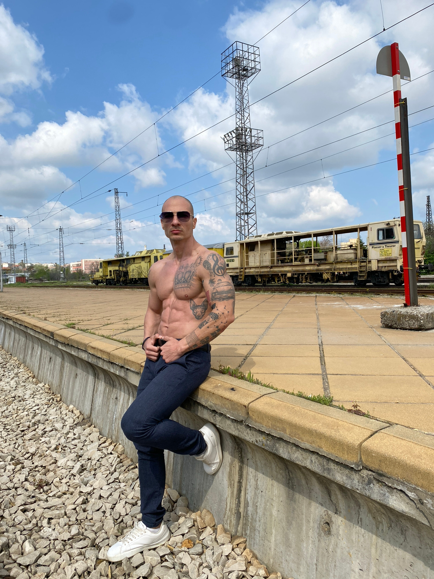 A muscular, tattooed man is seen reclining on a concrete surface next to a railway line in Pleven, Bulgaria, under a bright, partly cloudy sky. The man is shirtless, showcasing a well-defined physique…read more
