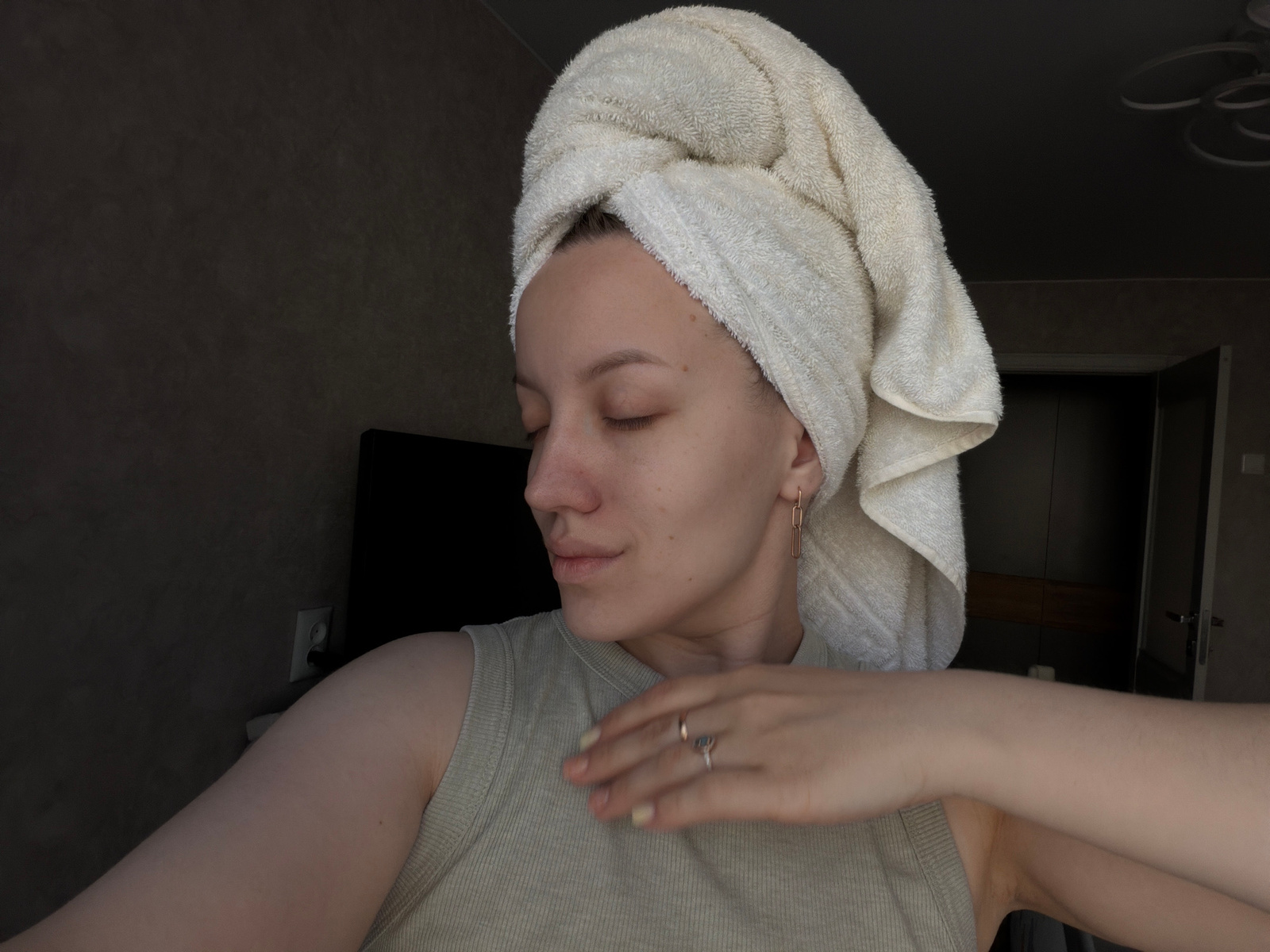 The image shows a person lying down with a white towel wrapped around their head. The person is wearing a light-colored shirt, and a hand with rings is touching their upper chest/neck area. The backgr…read more