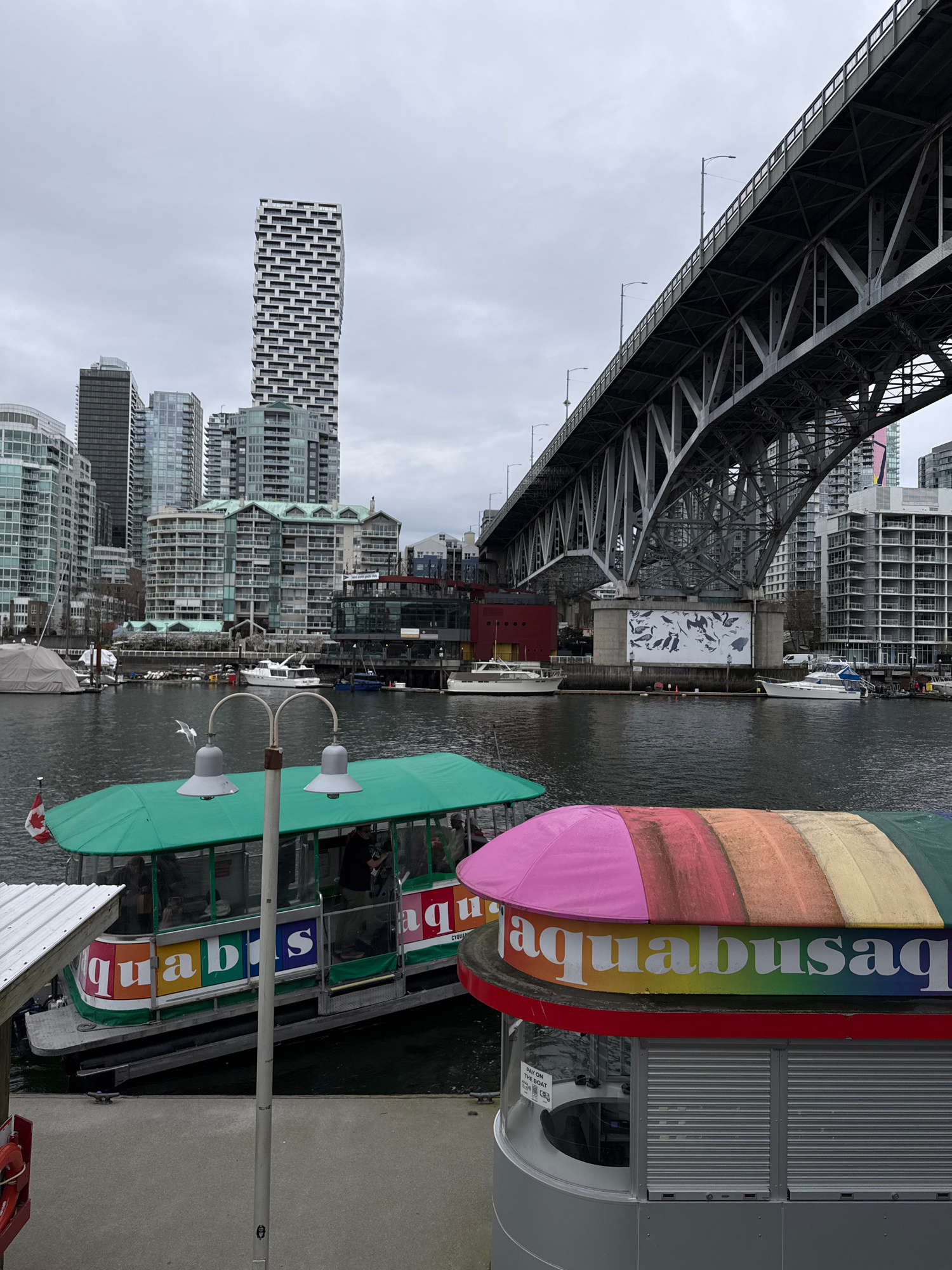 The image depicts a waterfront scene in Vancouver, Canada, featuring an Aquabus ferry docked at a pier. The ferry is painted with bright colors and the word "Aquabus" in large letters. In the backgrou…read more