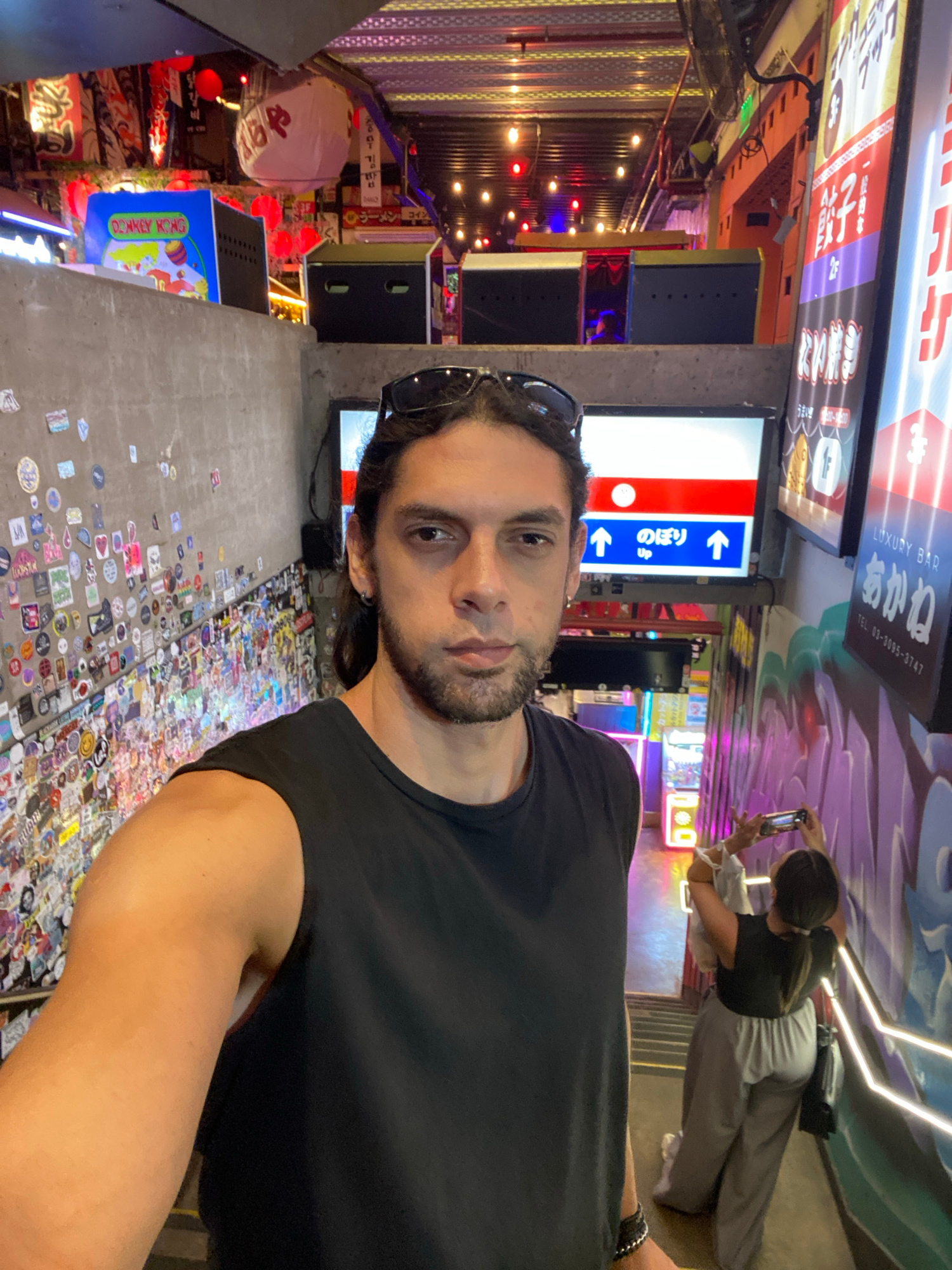 A man in a black t-shirt stands in an alleyway, taking a selfie. The alleyway is decorated with neon signs and stickers. In the background, a person is taking a picture with a smartphone. Signs in Jap…read more