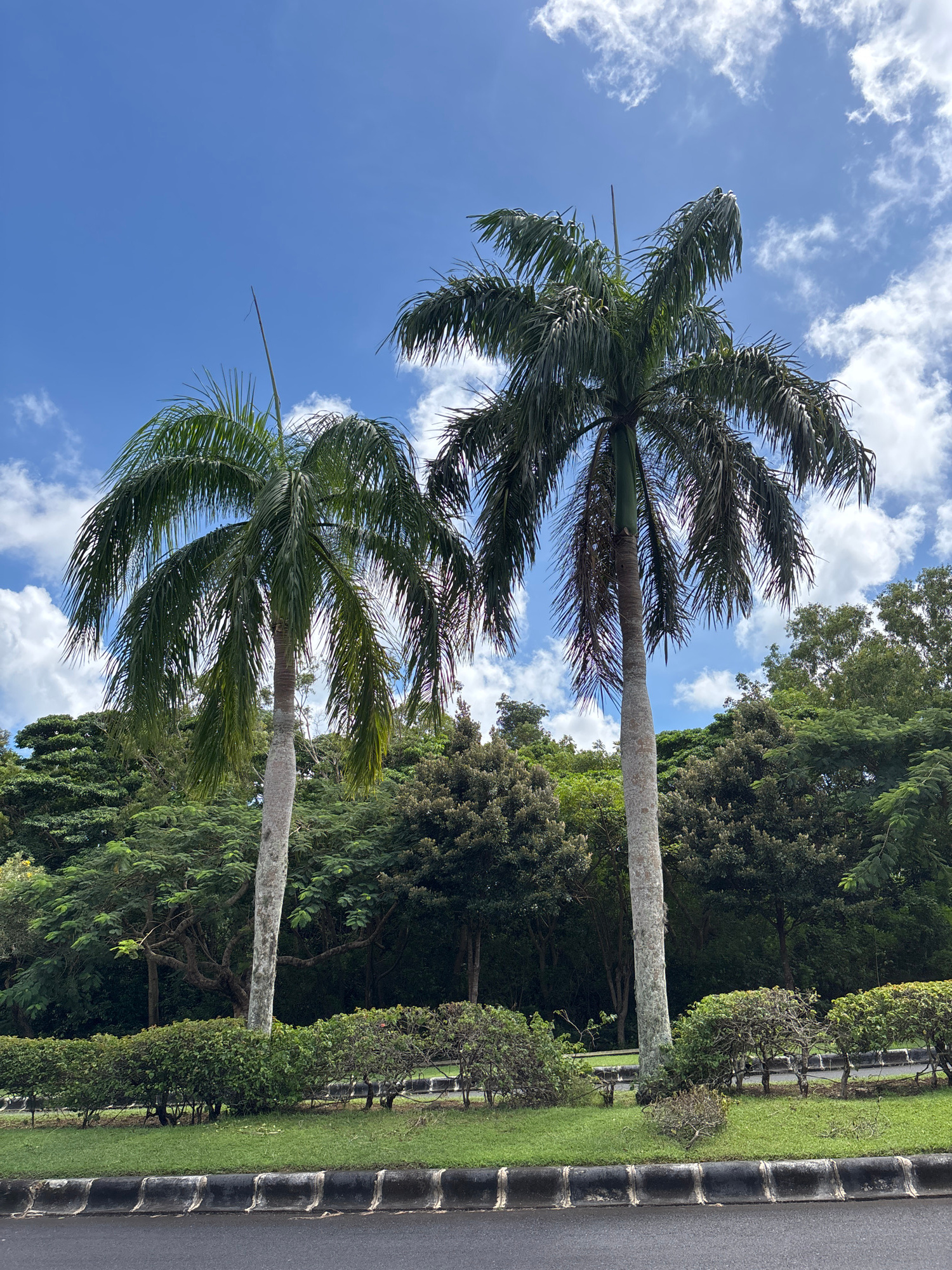 The image shows two palm trees against a blue sky with scattered white clouds. Adjacent to the trees are dense green foliage and manicured shrubs alongside a curb. The location is Pecatu, Indonesia.