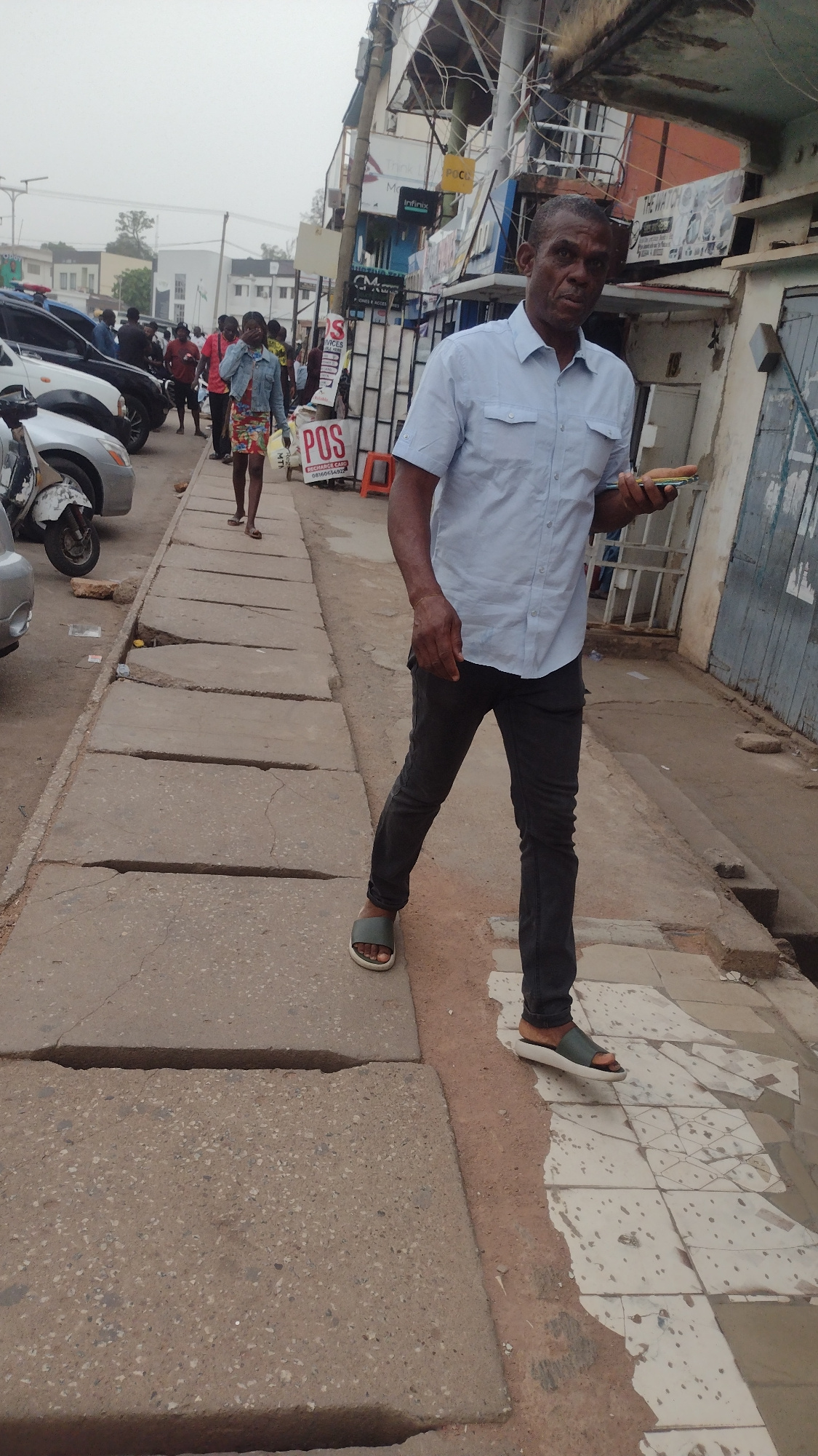 An adult male stands on a city street in Jos, Nigeria. He wears a light-blue short-sleeved button-down shirt, dark pants, and sandals. He holds a mobile phone in his right hand. The street features a…read more