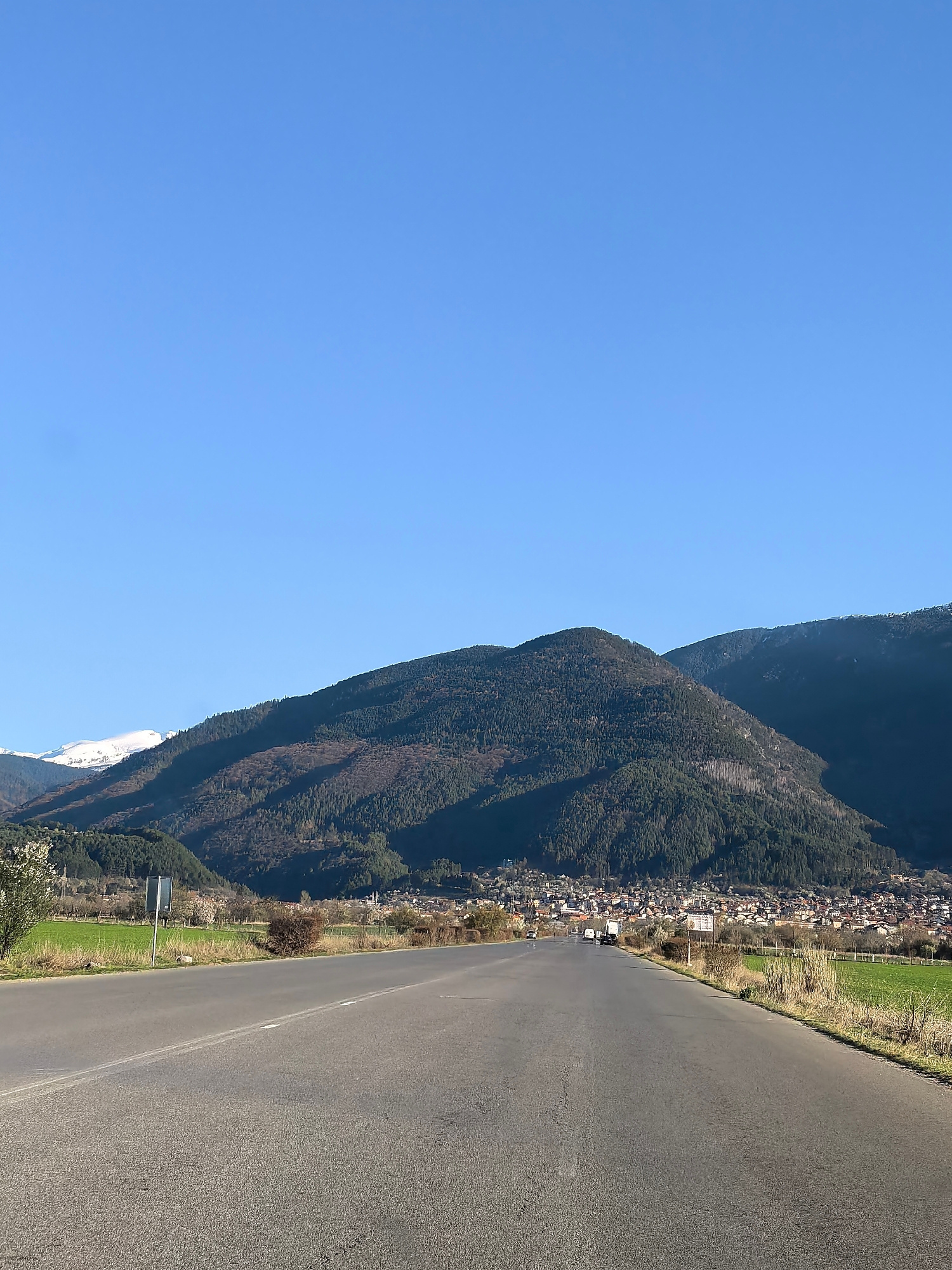 The image depicts a straight asphalt road leading towards a town nestled in front of a large, forested mountain range under a clear, blue sky. The road is flanked by fields and sparse vegetation on ei…read more