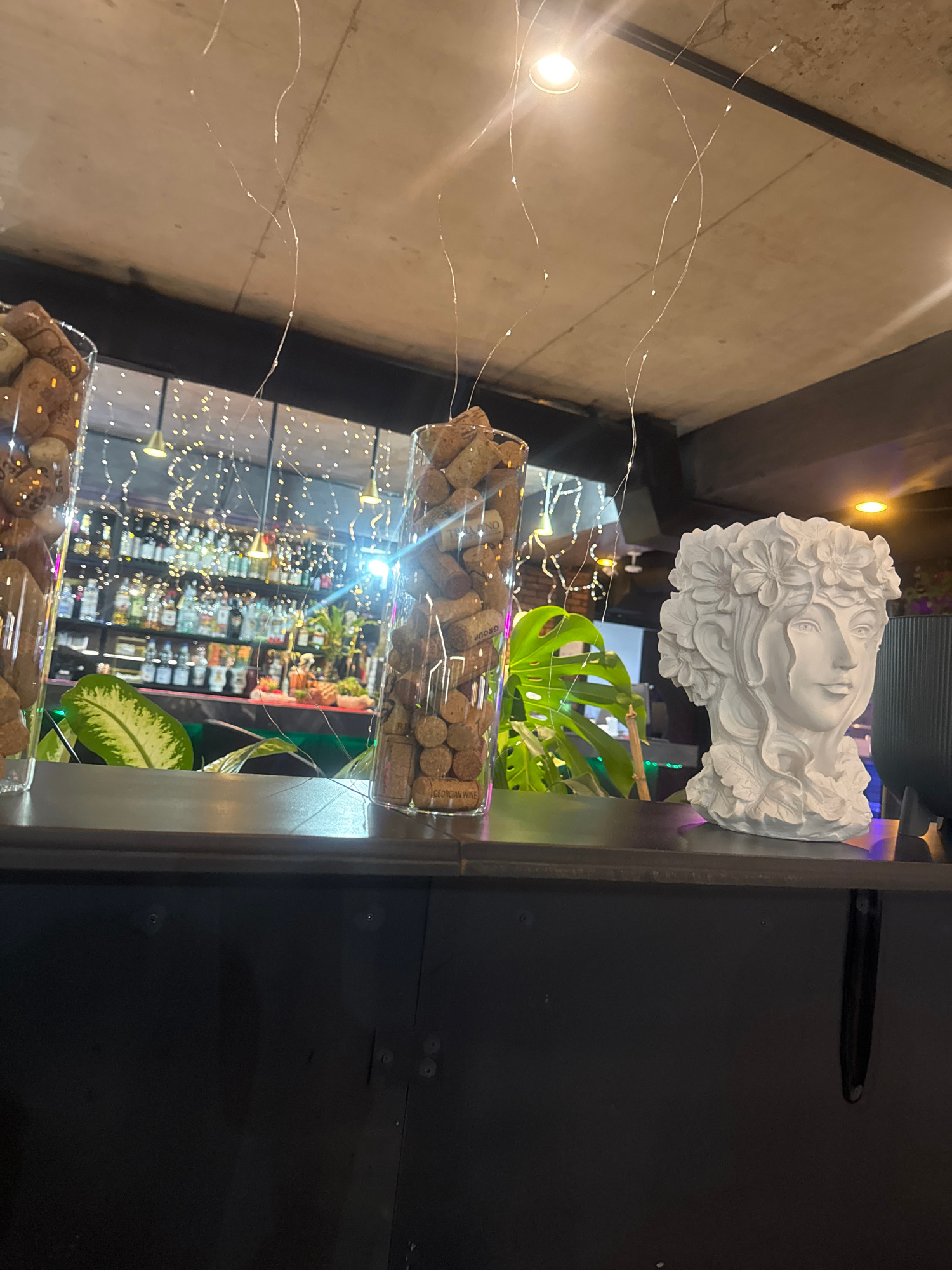 The image shows an interior setting, likely in a commercial space. A white bust sculpture of a woman with floral details in her hair is prominently displayed. Below the bust, a clear rectangular conta…read more