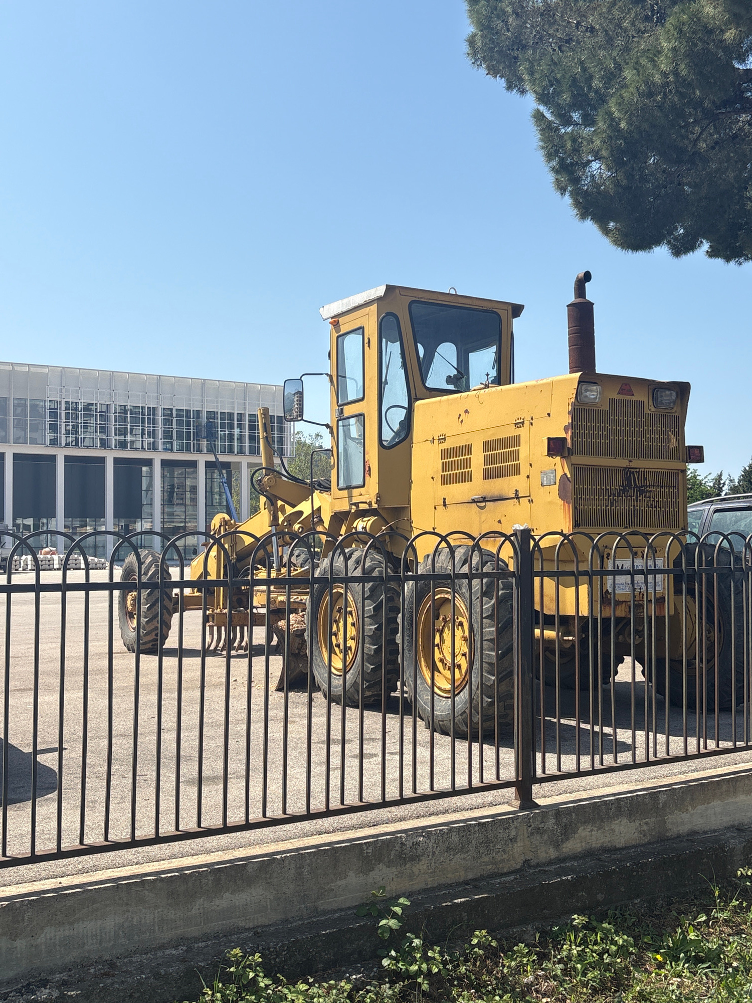 The image, taken in Bar, Montenegro, displays a large, yellow motor grader parked outdoors on a bright, sunny day. The construction vehicle, exhibiting signs of wear and rust, features a prominent exh…read more