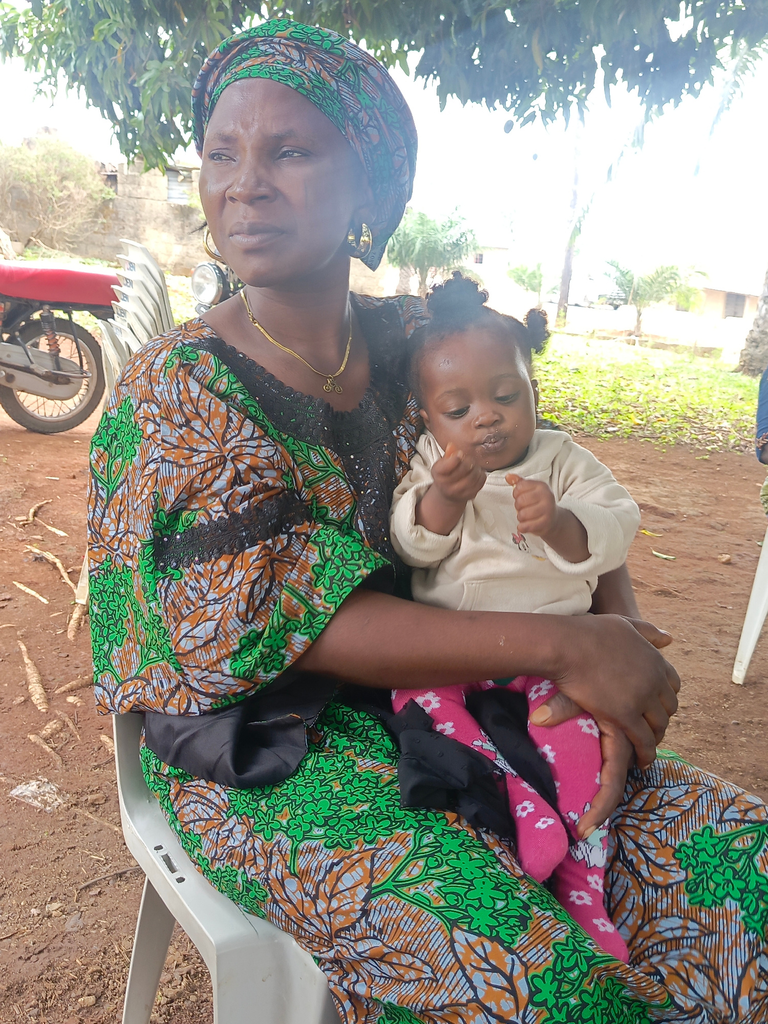 An outdoor, eye-level, medium shot captures an adult woman holding a baby on her lap in what appears to be a rural or semi-urban setting in Andaha, Nigeria. The woman, with dark skin, wears a vibrant,…read more
