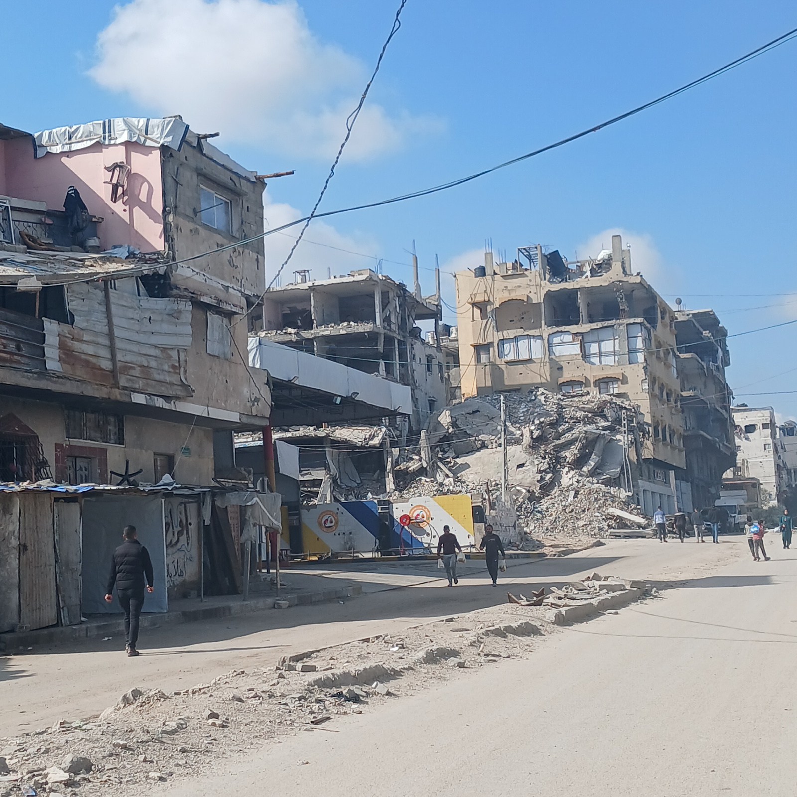 The image shows extensive destruction in an urban environment, likely in Gaza, Palestinian Territory. Several buildings are heavily damaged or completely collapsed, with rubble filling the area. A roa…read more