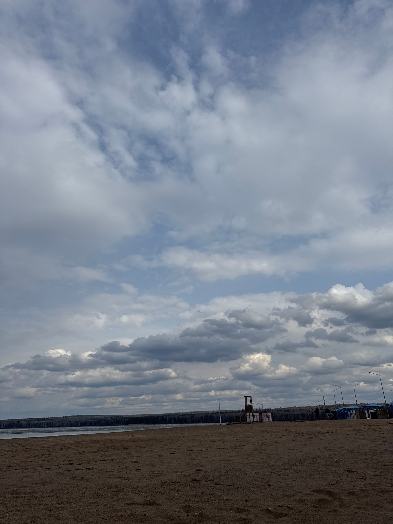 The image shows a view from the beach in Chaikovsky, Russia. The scene is divided into thirds: the sky occupies the left third, filled with predominantly gray and white clouds. The middle third featur…read more