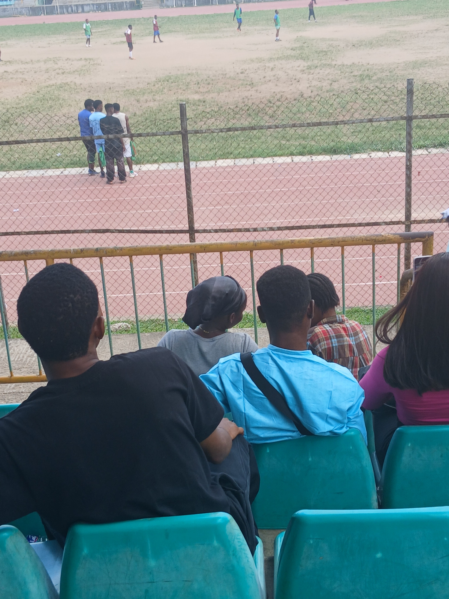 The image depicts a group of people sitting in green stadium seats, observing activities on a field beyond a fence. The field includes a running track and a grassy area. Some individuals in athletic a…read more
