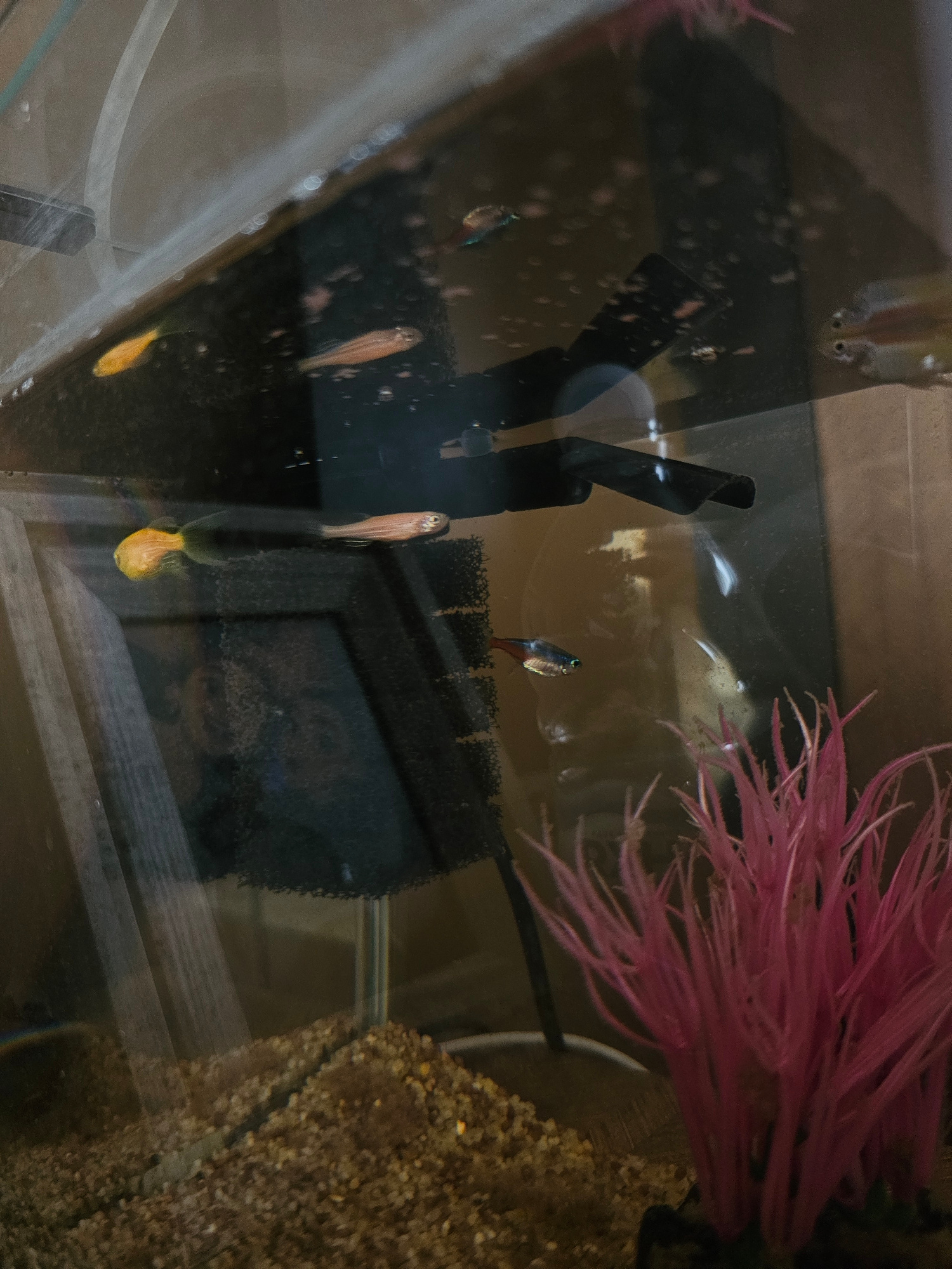 The image shows an aquarium. Several small fish are visible, including guppies with orange or yellow tails. A black filter is positioned in the center of the tank. A pink plastic plant sits in the upp…read more