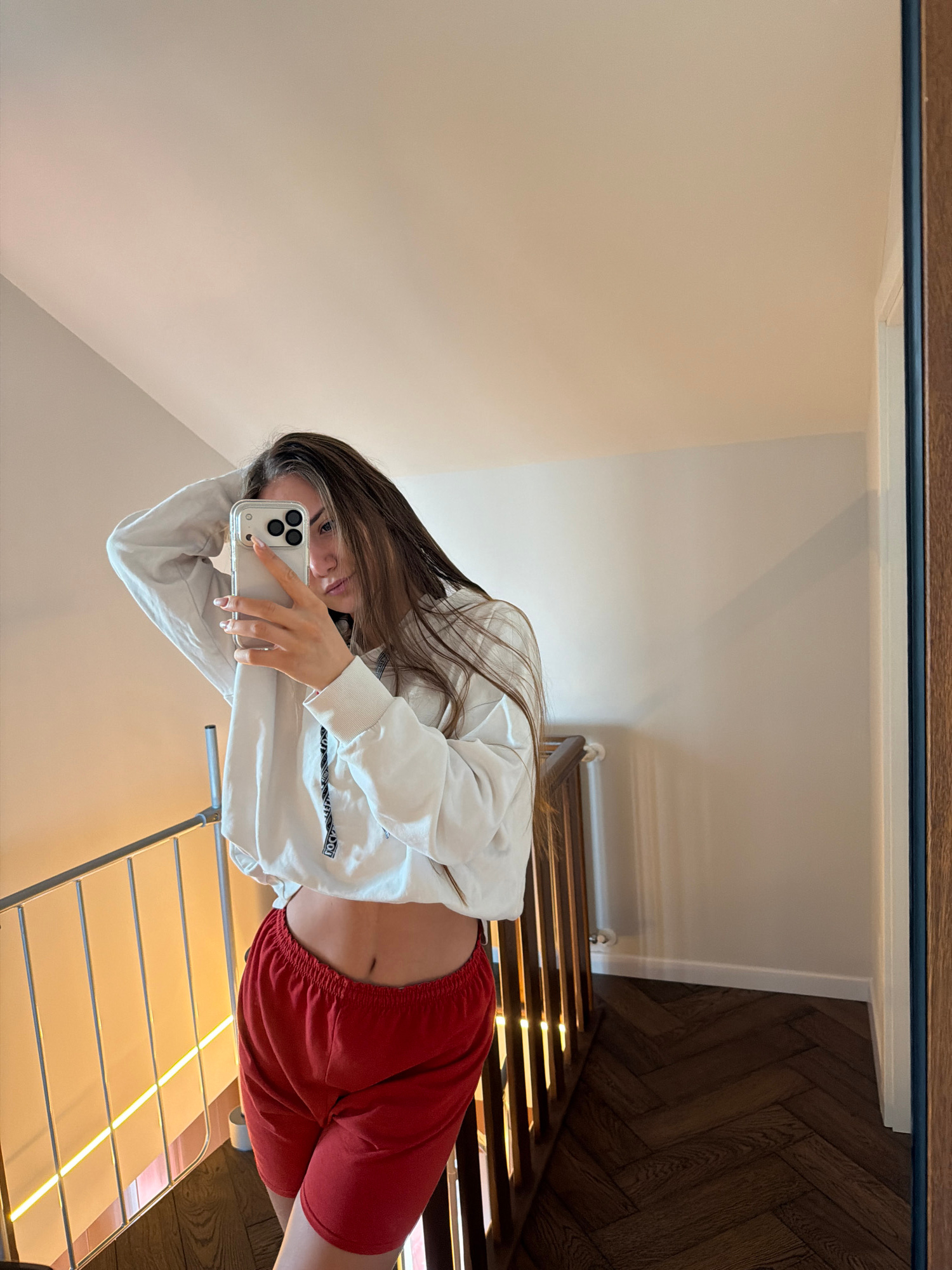 A young woman is taking a selfie in a mirror. She is wearing a white sweatshirt and red shorts, exposing her midriff. The reflection shows a room with a white wall, a wooden floor, and a metal drying…read more
