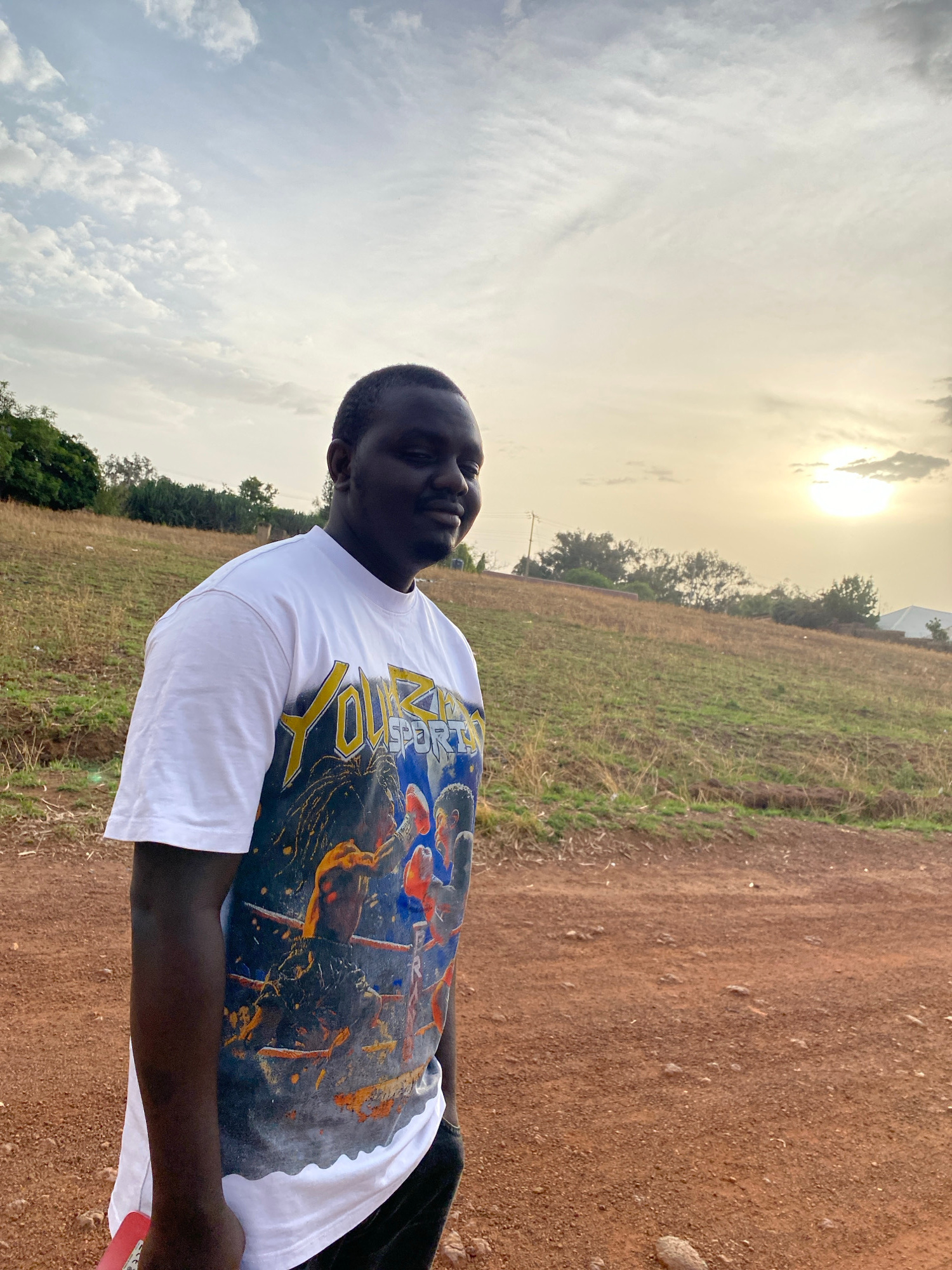 A person is standing in a rural area near Bukuru, Nigeria. The individual is wearing a white T-shirt with a large graphic print. The landscape includes dirt roads, grasslands, sparse vegetation, and t…read more
