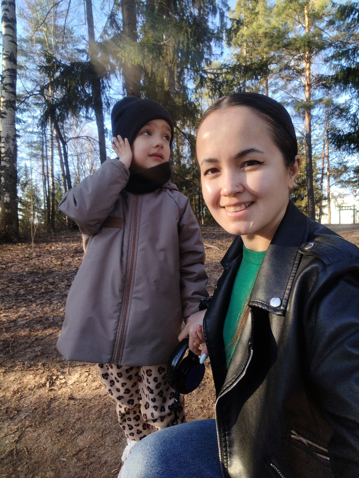 A selfie photograph shows an adult woman and a child outdoors. The woman is on the right side of the image, wearing a black leather jacket over a green sweater and blue jeans. The child, on the left,β¦read more
