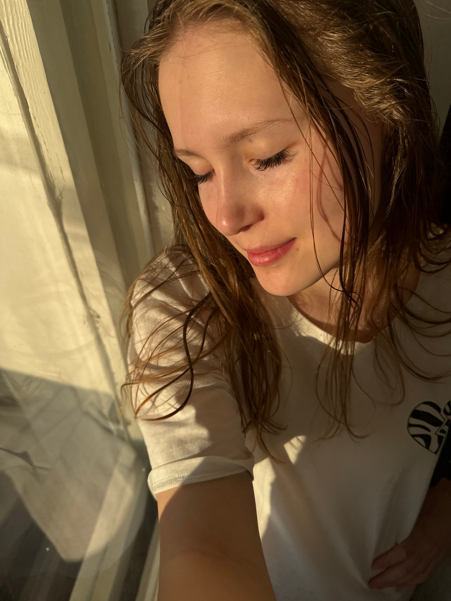 A young woman with wet brown hair lies on what appears to be a window sill. Her eyes are closed. She is wearing a white t-shirt. The setting sun casts long shadows across the sill. It is not possible…read more
