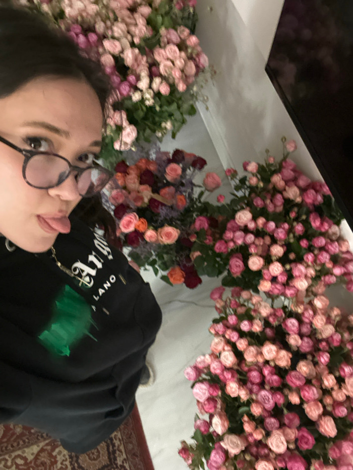 This image depicts a female individual taking a selfie in what appears to be a floral shop or display area in Yerevan, Armenia. The subject's face is visible in the upper left, characterized by dark h…read more