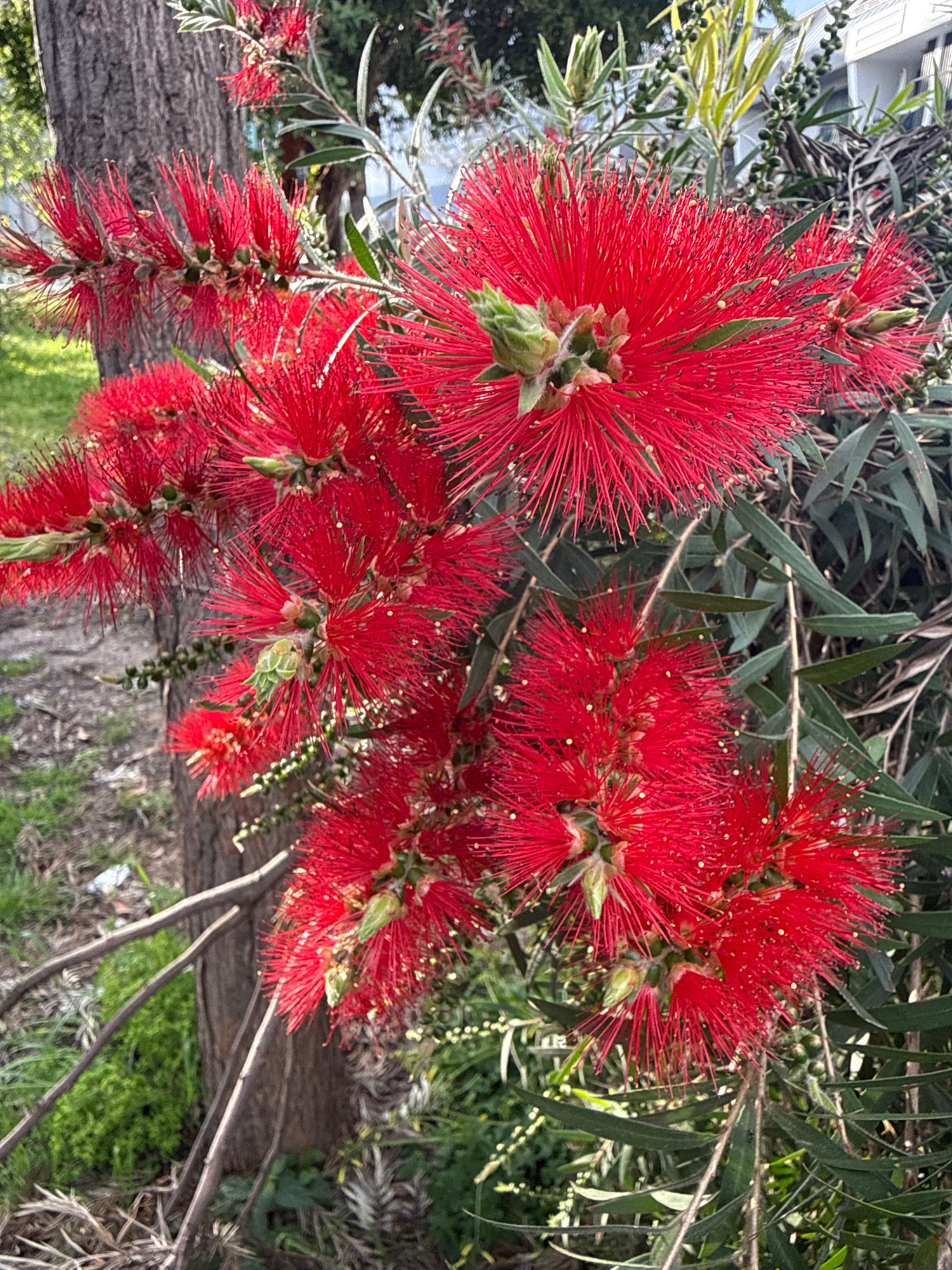 The image features a close-up view of several vibrant red bottlebrush flowers in full bloom. The flowers are characterized by their cylindrical shape and numerous filamentous stamens, creating a disti…read more