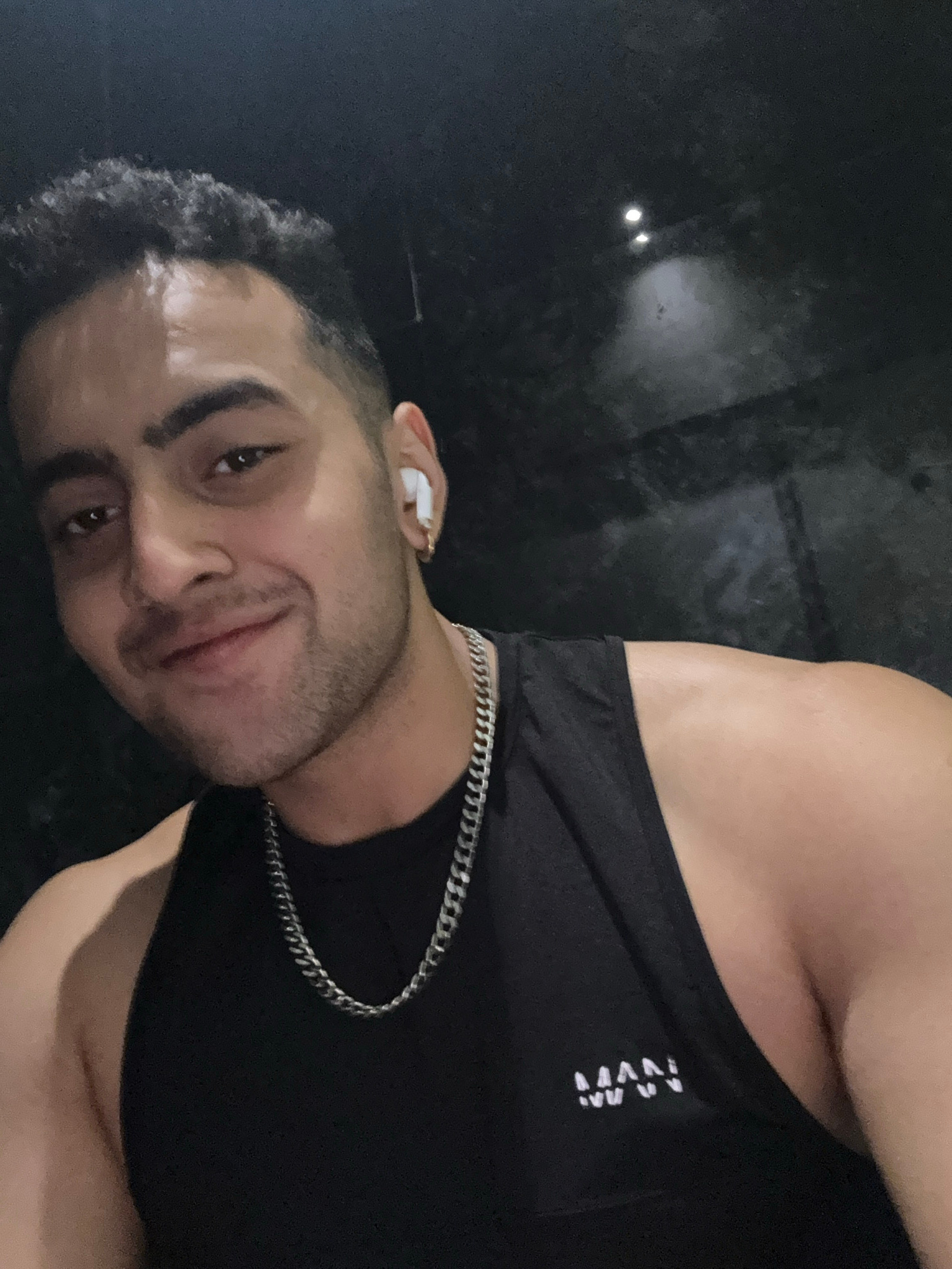 A close-up, low-angle shot features a man with dark hair and eyes, fair skin, and light stubble on his face. He is wearing a black tank top with the word "MAN" vertically printed in white on the right…read more