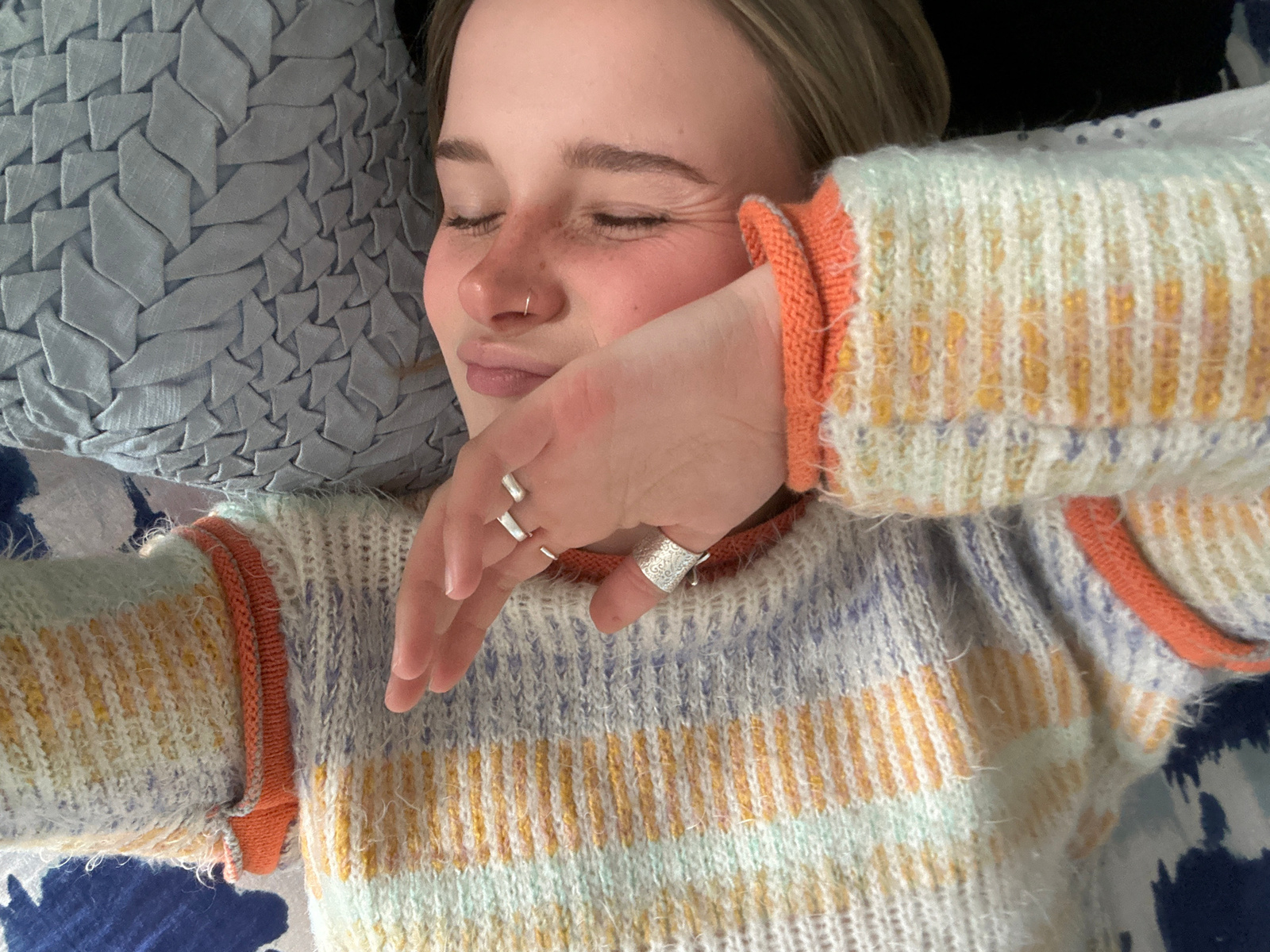 A person lies on their back on a bed or sofa. They are wearing a striped sweater with white, yellow, purple, and orange stripes, and their right hand covers their face. The person wears multiple rings…read more