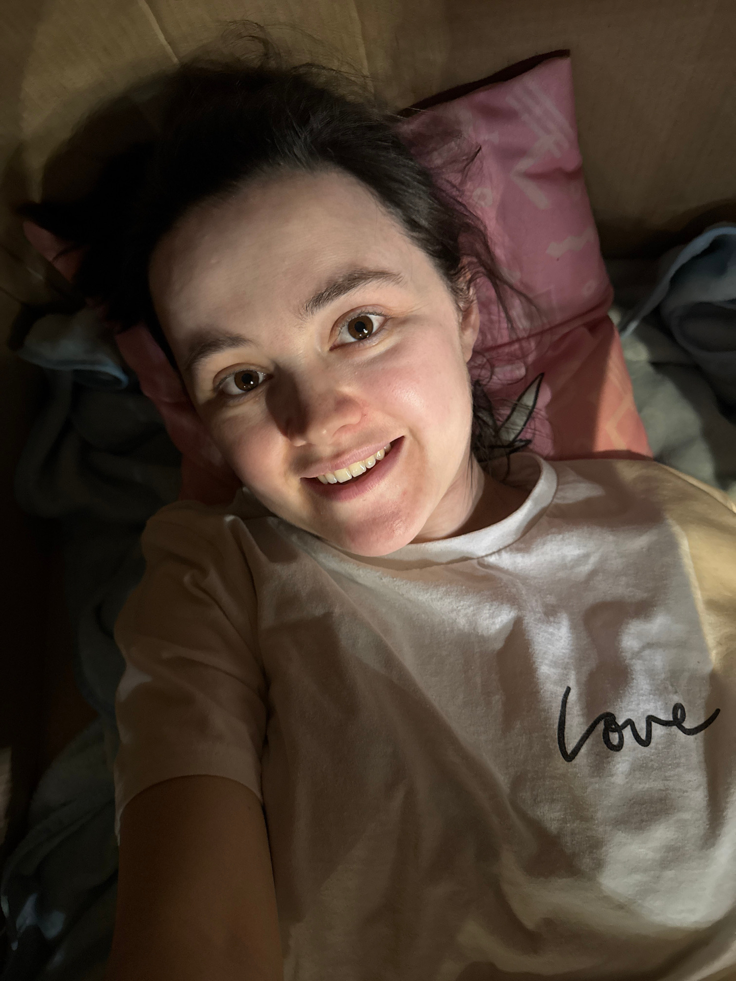 A woman is lying down and smiling at the camera. She is wearing a white t-shirt with the word "love" written on the shoulder. She is surrounded by pillows and blankets. It is not possible to ascertain…read more