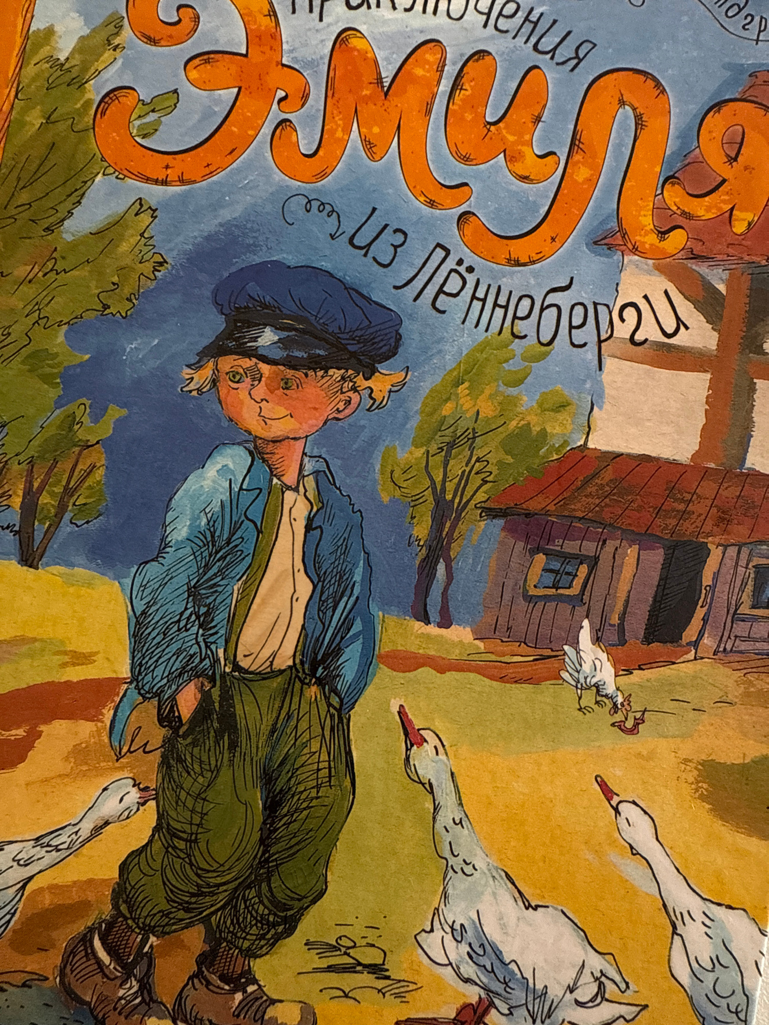 The image is an illustration from a children's book. It depicts a young boy wearing a blue cap and blue jacket over a beige vest, with green trousers and brown shoes. He appears to be lying on his sto…read more