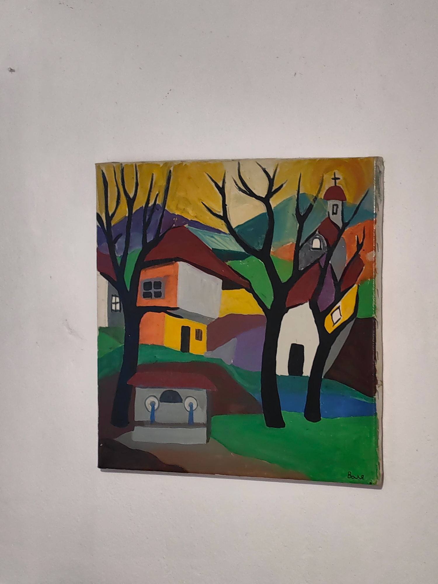 The image is a painting of a rural scene, likely inspired by the village of Damianovo, Bulgaria. The painting features stylized houses with red roofs and colorful walls (orange, yellow, white). There…read more
