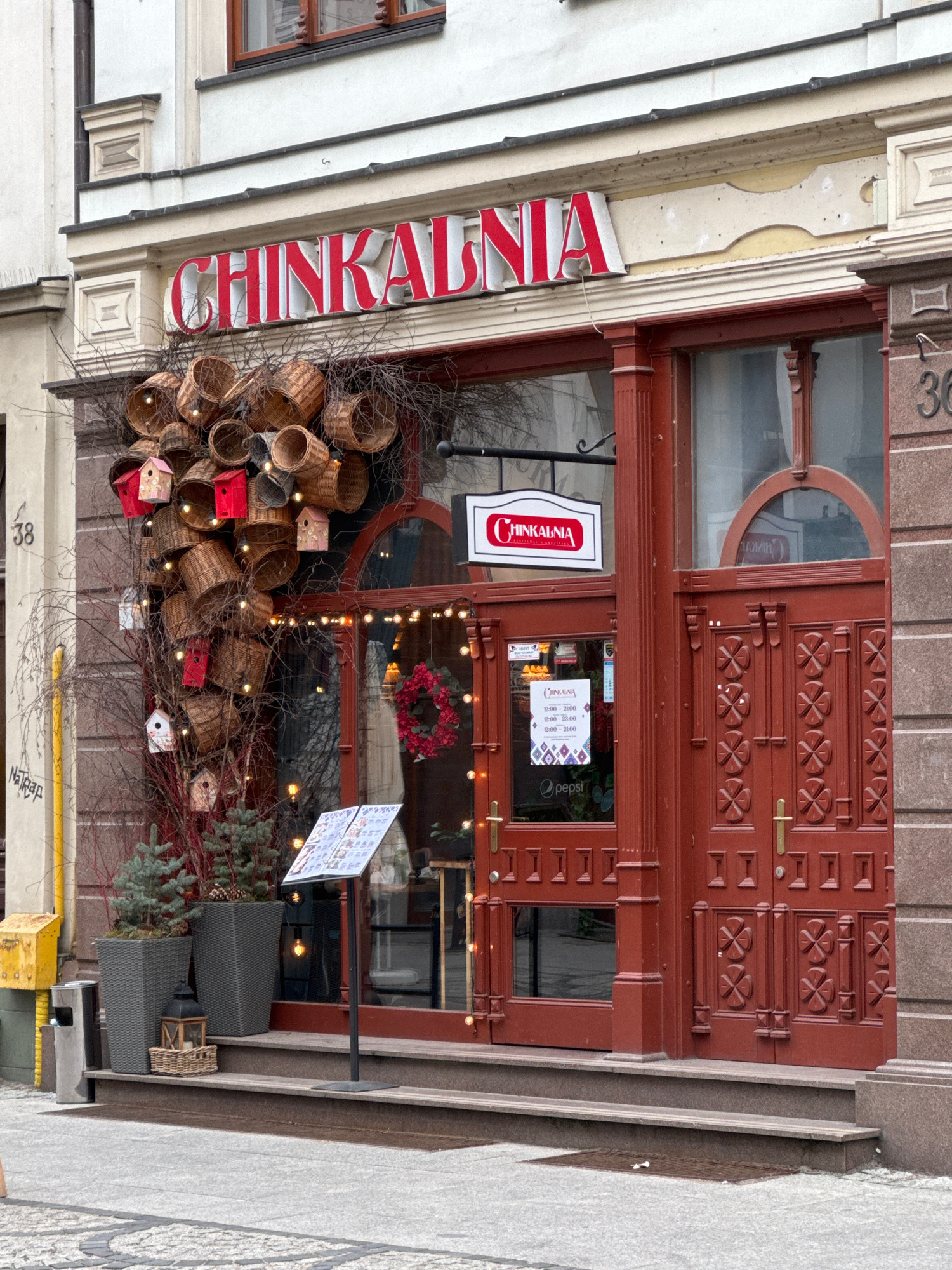 The photograph depicts the exterior of a restaurant named "Chinkalnia" in Bydgoszcz, Poland. The building features a red facade with a door that has decorative wooden patterns. The restaurant's name i…read more