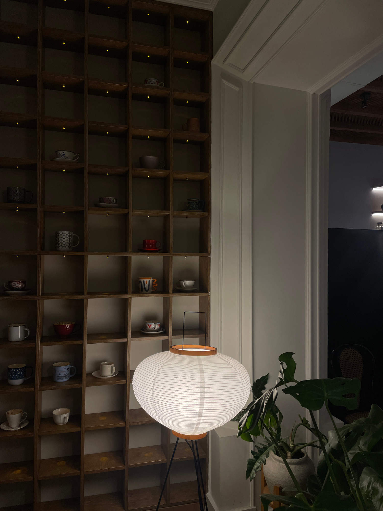 The photograph depicts an interior space in Yerevan, Armenia. A large, custom wooden shelving unit fills the lower half of the frame, displaying various coffee cups or mugs in different styles, and sm…read more