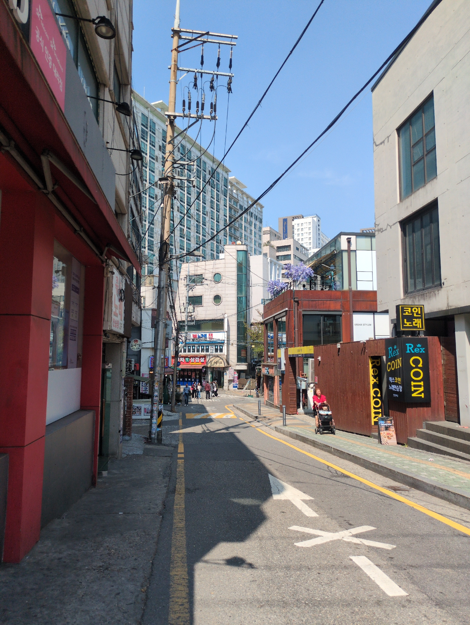 This is a street scene in Seoul, South Korea. The view is of a narrow city street with sidewalks, buildings on both sides, power lines, and people. The buildings vary in height and architectural stylβ¦read more