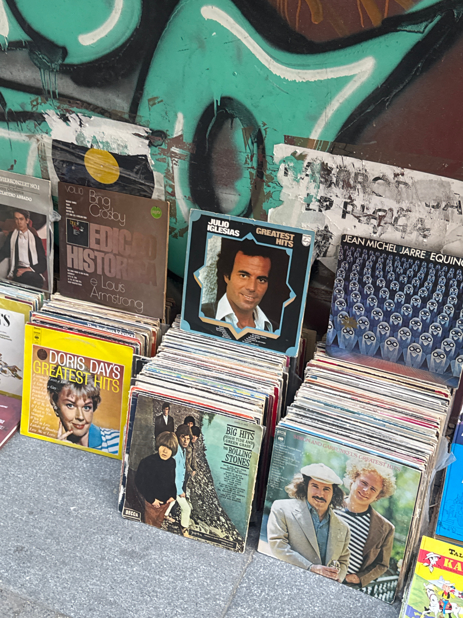 The image captures a selection of vinyl records for sale on a surface with patches of graffiti in Belgrade, Serbia. Record covers visible include "Greatest Hits" by Julio Iglesias, "Greatest Hits" by…read more