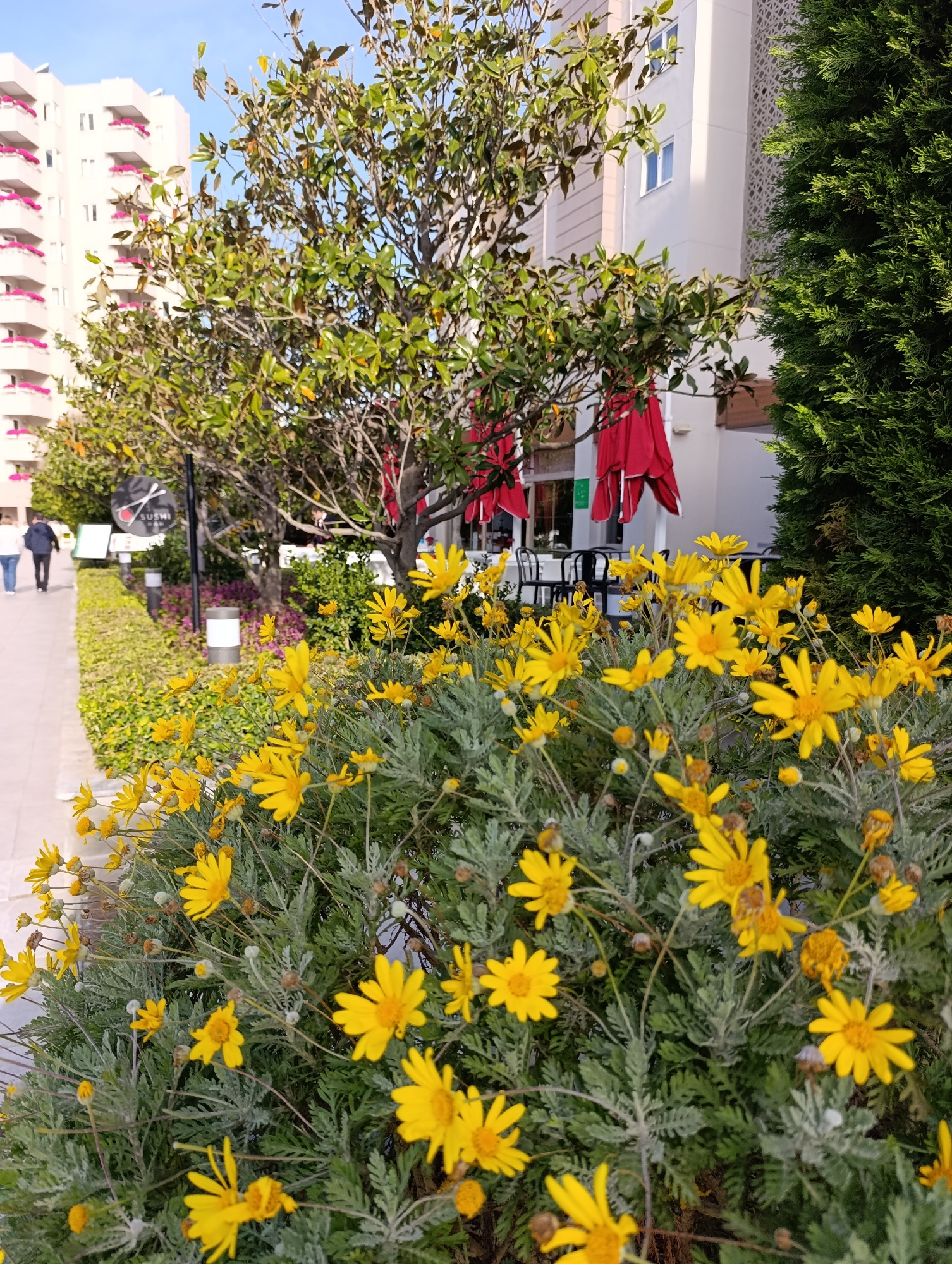 The scene captures a vibrant display of yellow daisy-like flowers in the foreground, possibly Euryops pectinatus, with grey-green foliage. Behind the flowers, a paved walkway leads past a lush green hedge and a row of trees. A building with pink accents on the balconies is visible in the background on the left, while a modern building with white walls stands on the right. Red awnings are noticeable above tables and chairs outside what appears to be a restaurant or cafe. Two people are walking in the background on the left side of the image. A sign with the word "SUSHI" is also visible. The clear blue sky indicates a sunny day. Based on the information provided, this scene is located in the city of Aksu, Turkey. | Open Wire