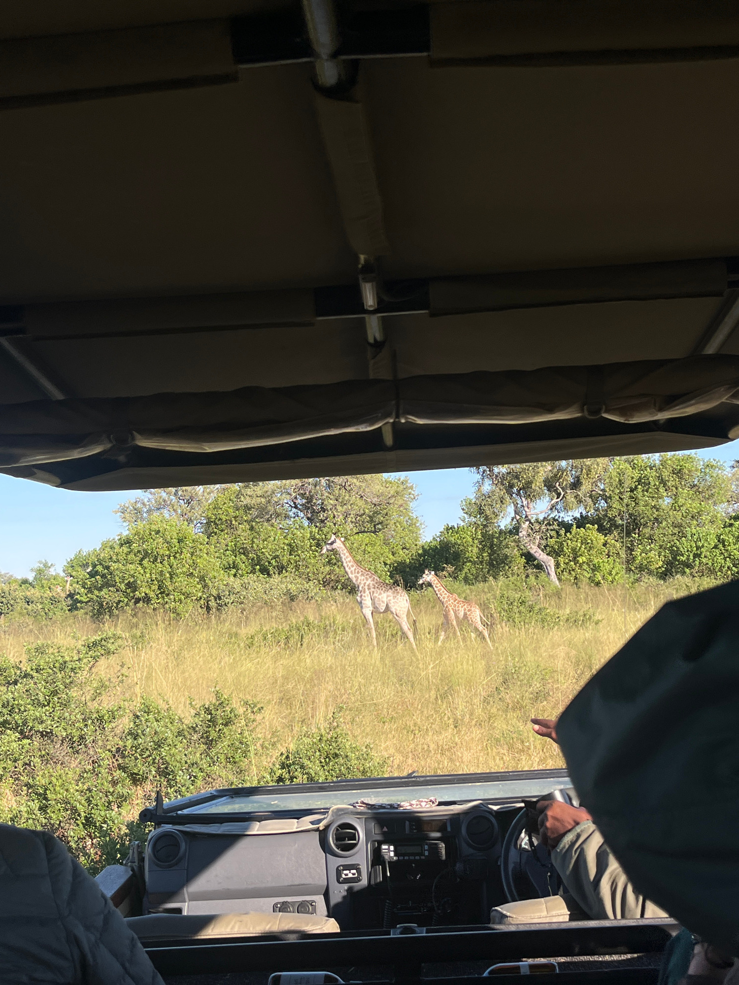 From inside a vehicle with khaki canvas seats and open roof, three giraffes are seen grazing in tall, dry grass interspersed with trees in Nwanaeanoka, Botswana. The driver, a person of color wearing…read more