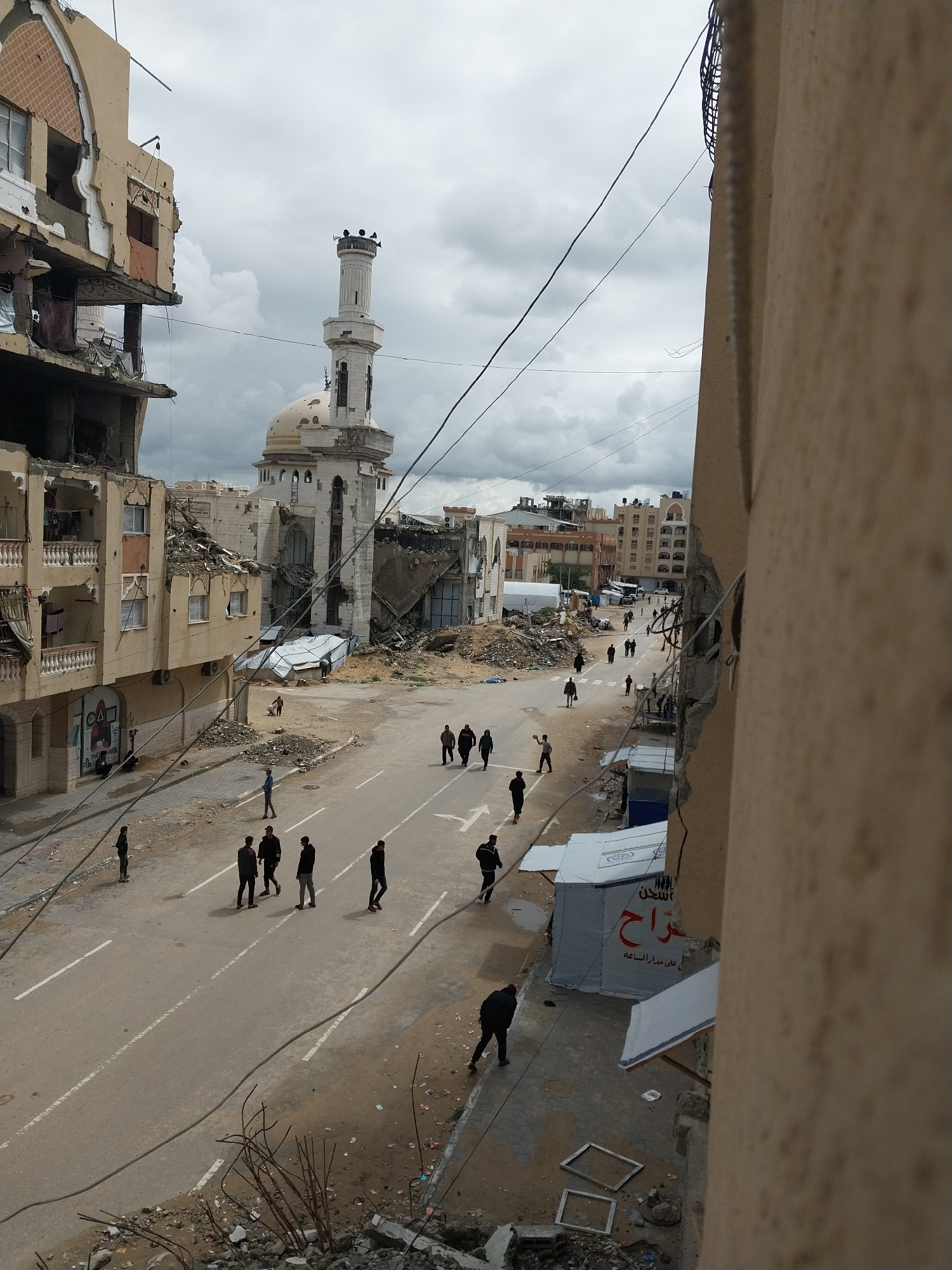 An overhead view captures a street scene in Khan Yunis, Palestinian Territory, under an overcast sky. The environment is characterized by extensive structural damage to buildings on both sides of the…read more