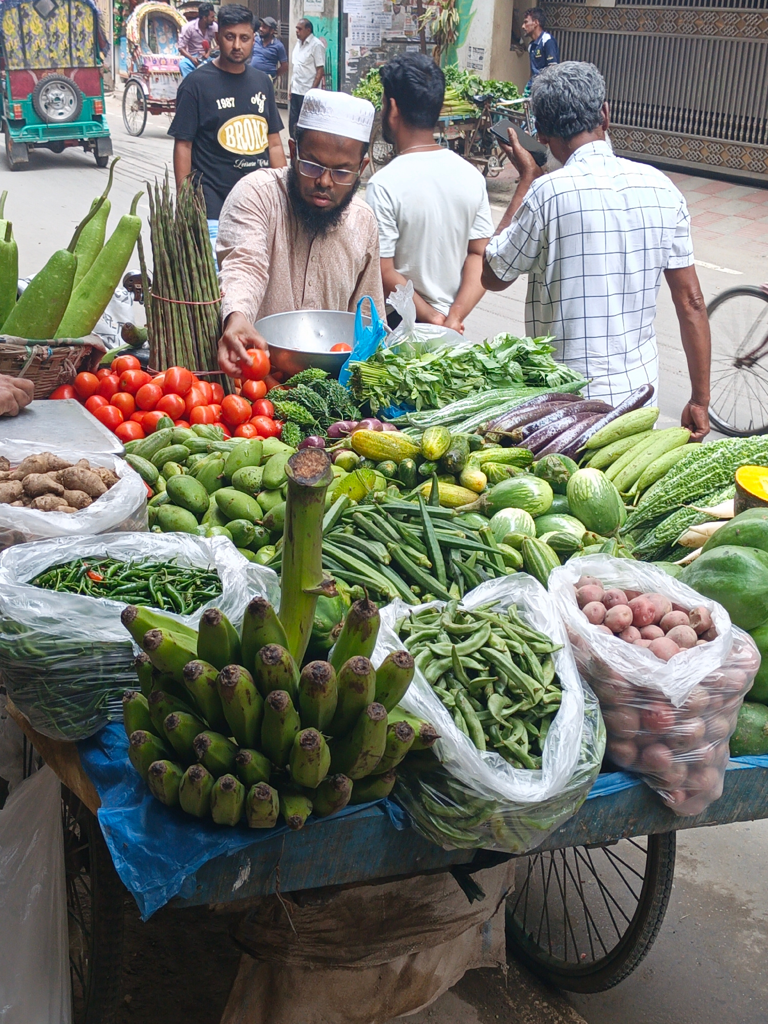 This image captures a bustling street market scene in Dhaka, Bangladesh, focusing on a mobile vegetable and fruit stall. The central figure is a male vendor wearing a white prayer cap, glasses, and a…read more