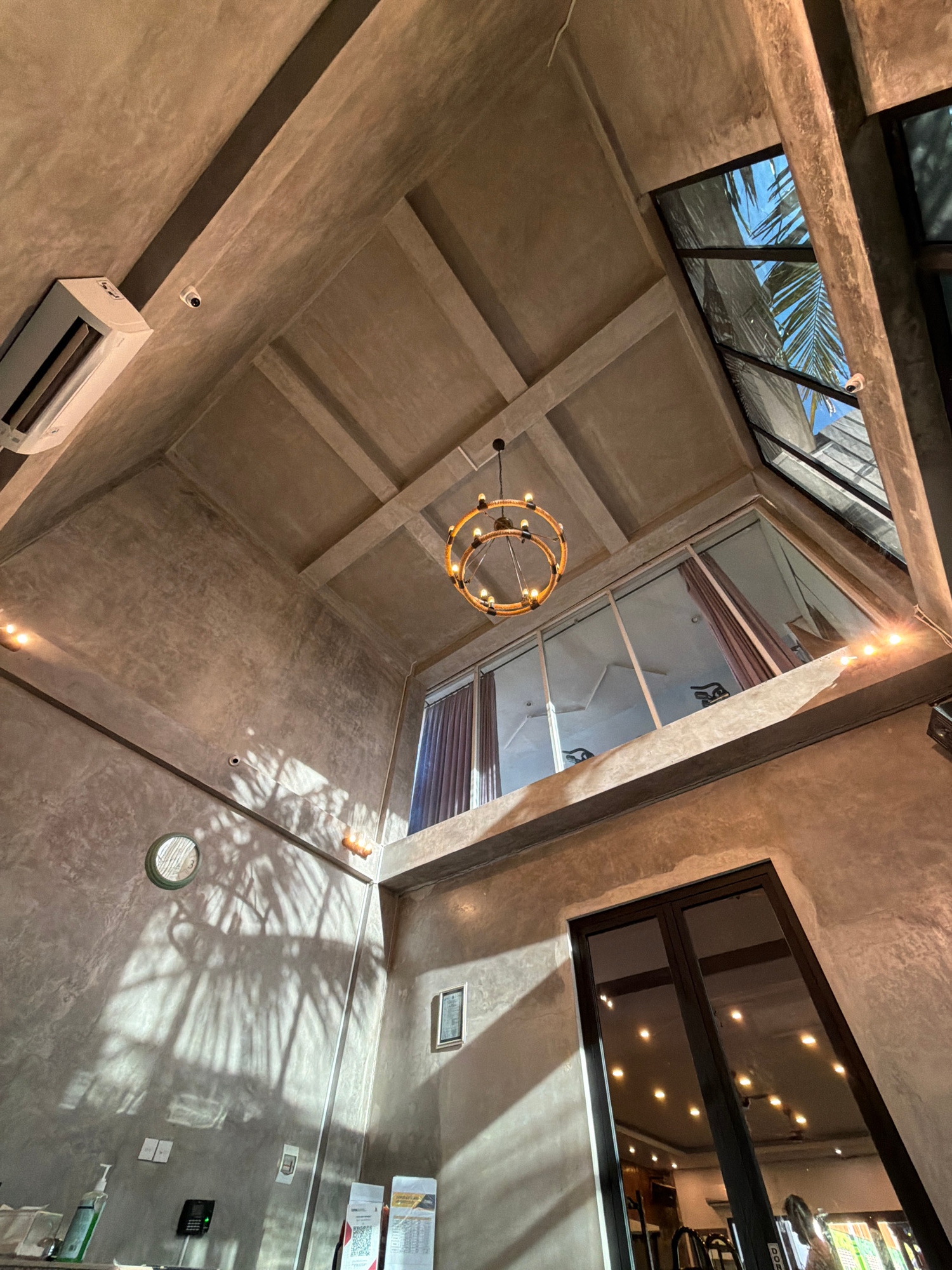 The image shows an upward-angled view of an interior space in North Kuta, Indonesia. The architectural design is characterized by exposed concrete surfaces and a network of intersecting support beams.…read more