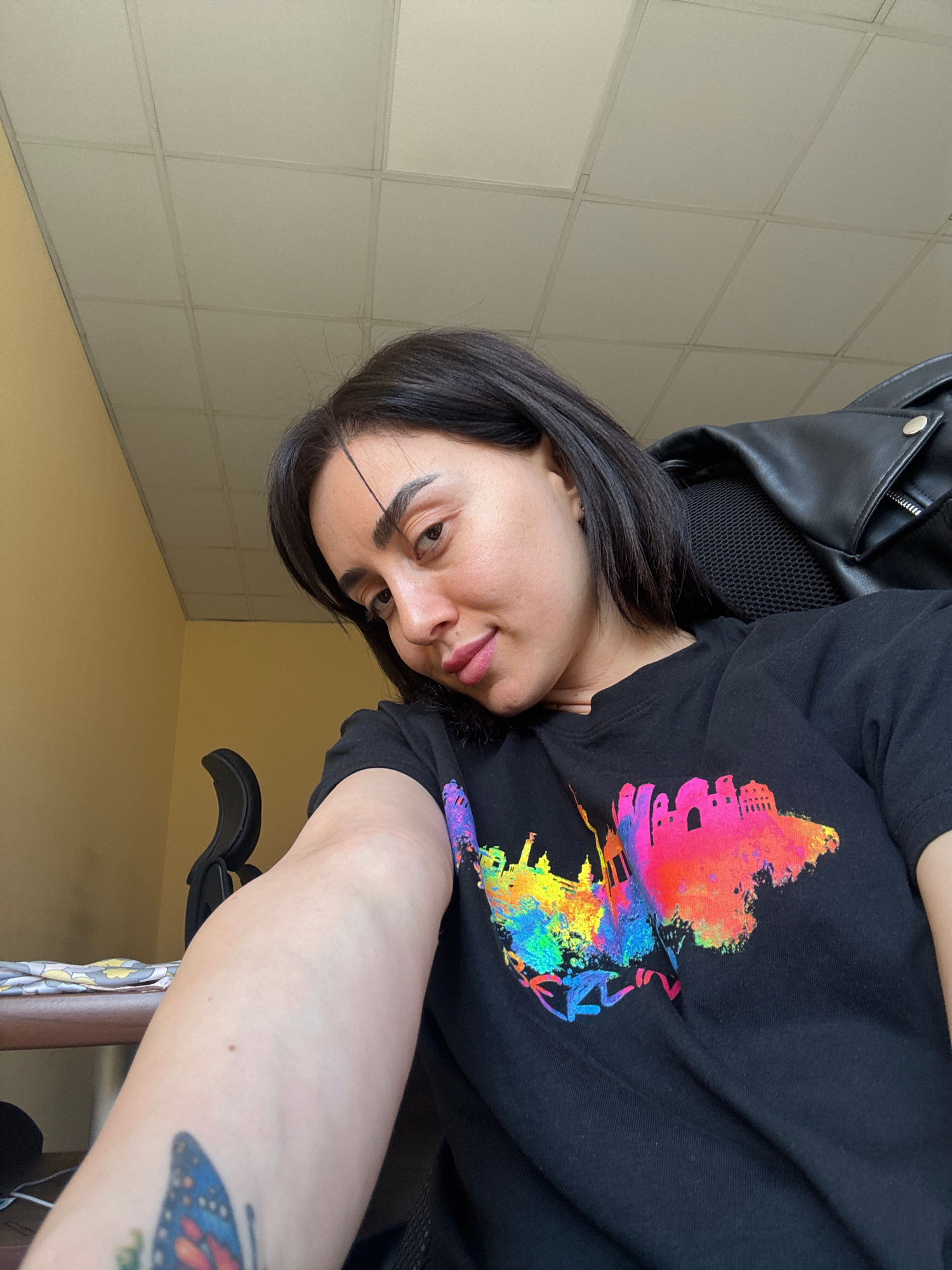 A woman is sitting in a chair, wearing a black t-shirt with a colorful graphic print resembling the skyline of Tbilisi, Georgia. She has dark hair and is looking at the camera. There is a black leatheβ¦read more