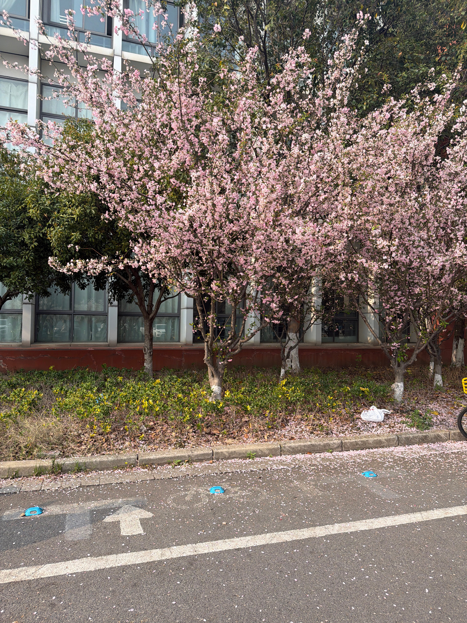 The image depicts a scene in Jiangning District, China, featuring flowering trees in full bloom alongside a building and a street. The trees have delicate pink blossoms, with petals scattered on the gβ¦read more