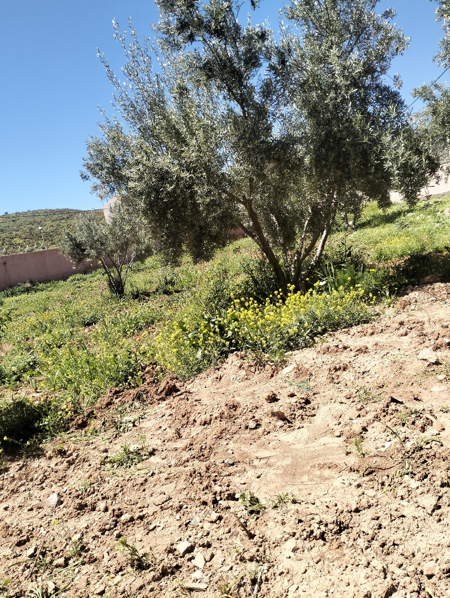 The image depicts a landscape in Ouaouizert, Morocco, characterized by olive trees in various sizes scattered across a hillside. The foreground consists of reddish-brown, rocky soil, with sparse veget…read more