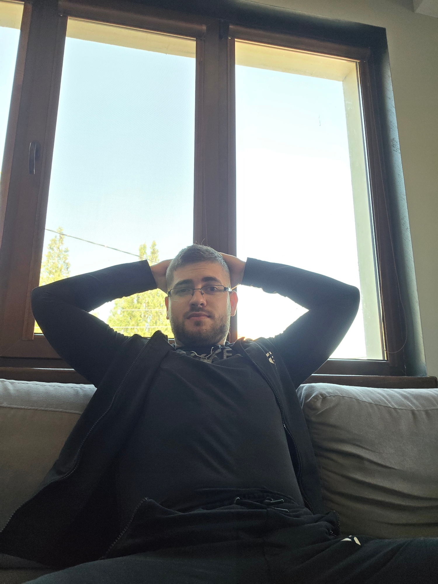 A man with a beard and glasses is lying on a couch in front of a window. The man is wearing a dark top and has his arms raised, resting behind his head. The window offers a view of trees against a blu…read more