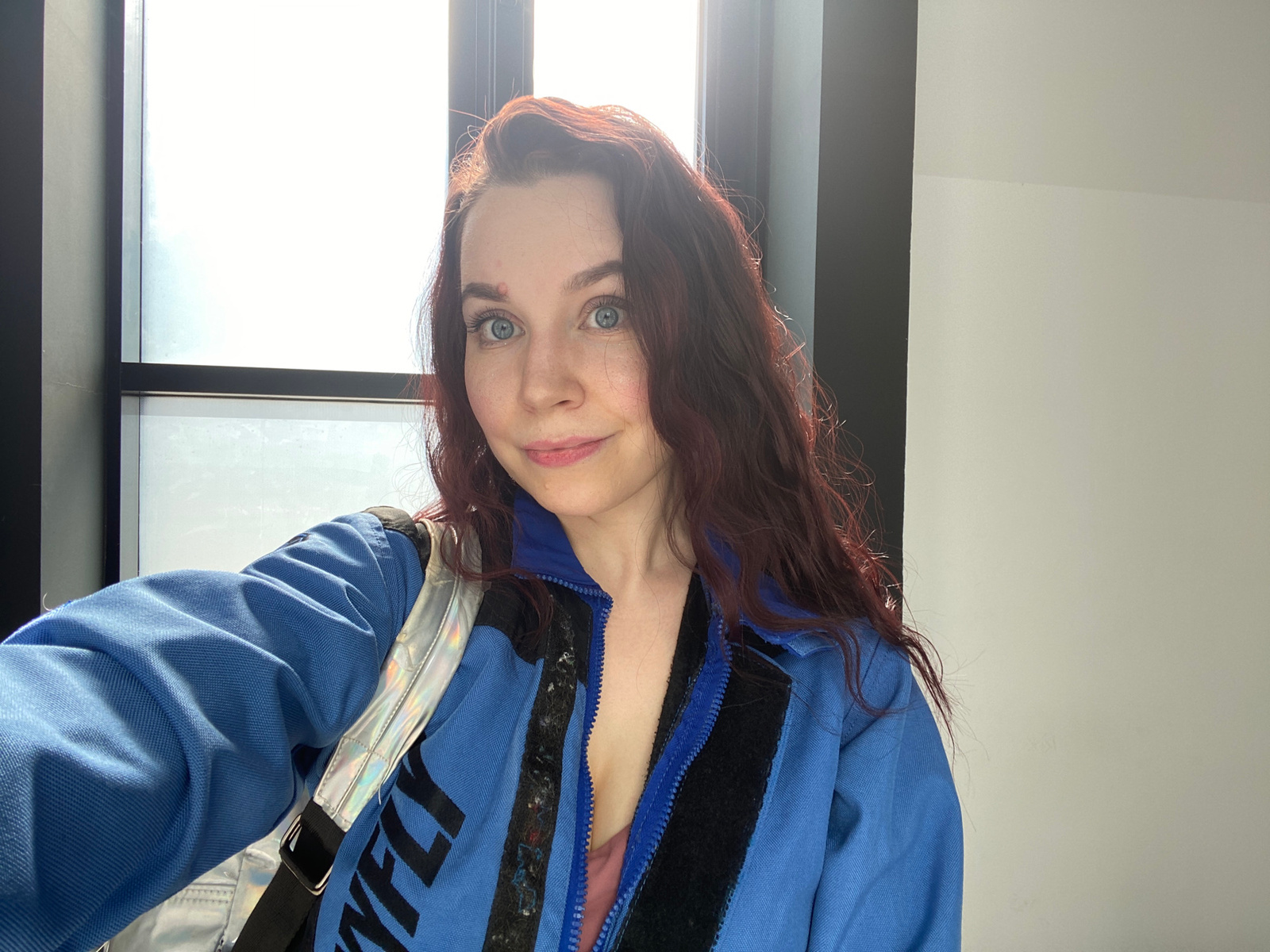 A fair-skinned woman with red-brown hair stands in front of a bright window. The photo is oriented so that the woman's head is at the bottom of the frame. She is wearing a blue jacket with a zipper pa…read more