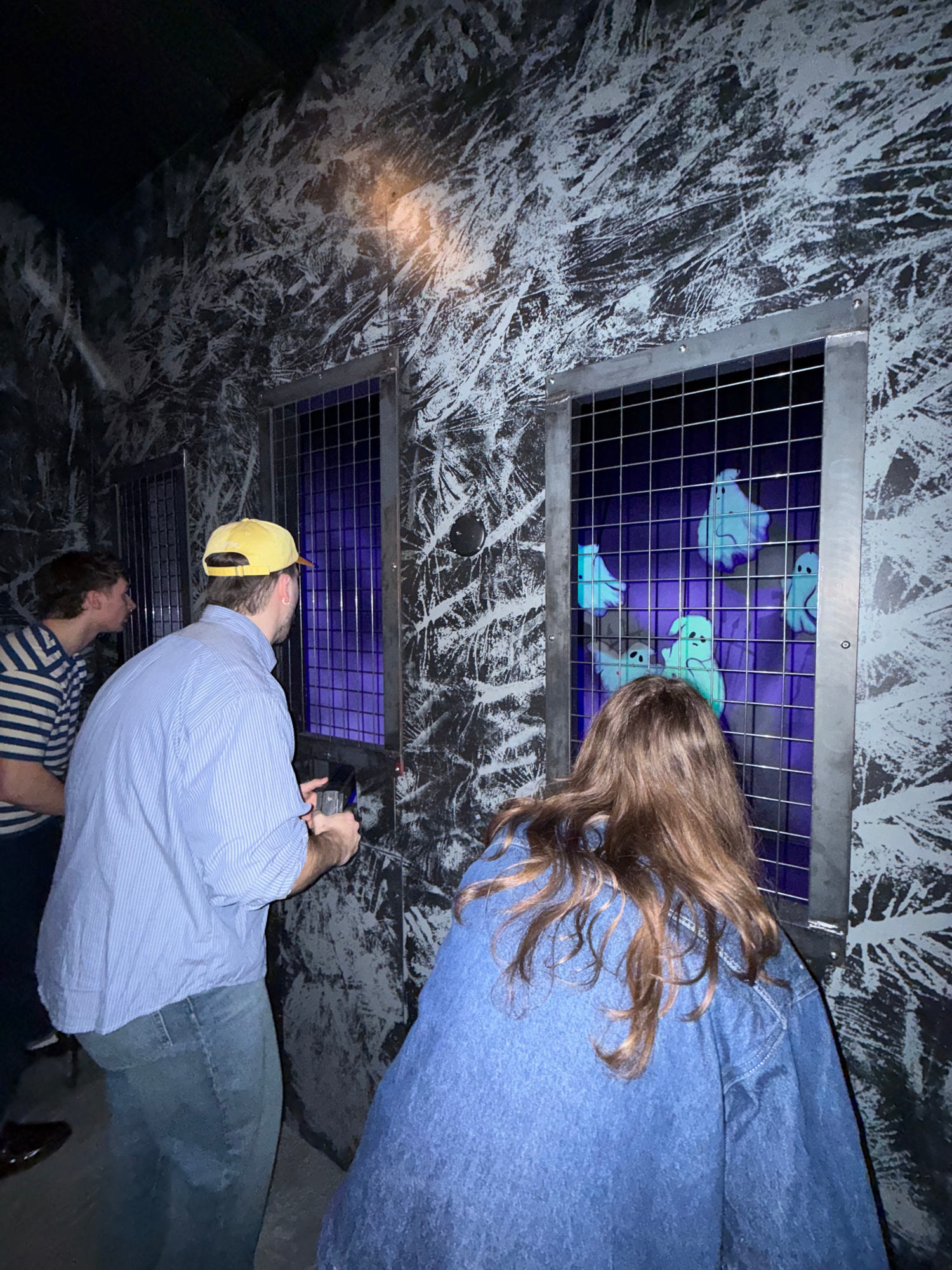 Three people are looking up into a grated opening in a ceiling. The grated opening displays cartoon ghosts in a blue-lit space. A woman with long brown hair in a denim jacket is near the top opening.…read more