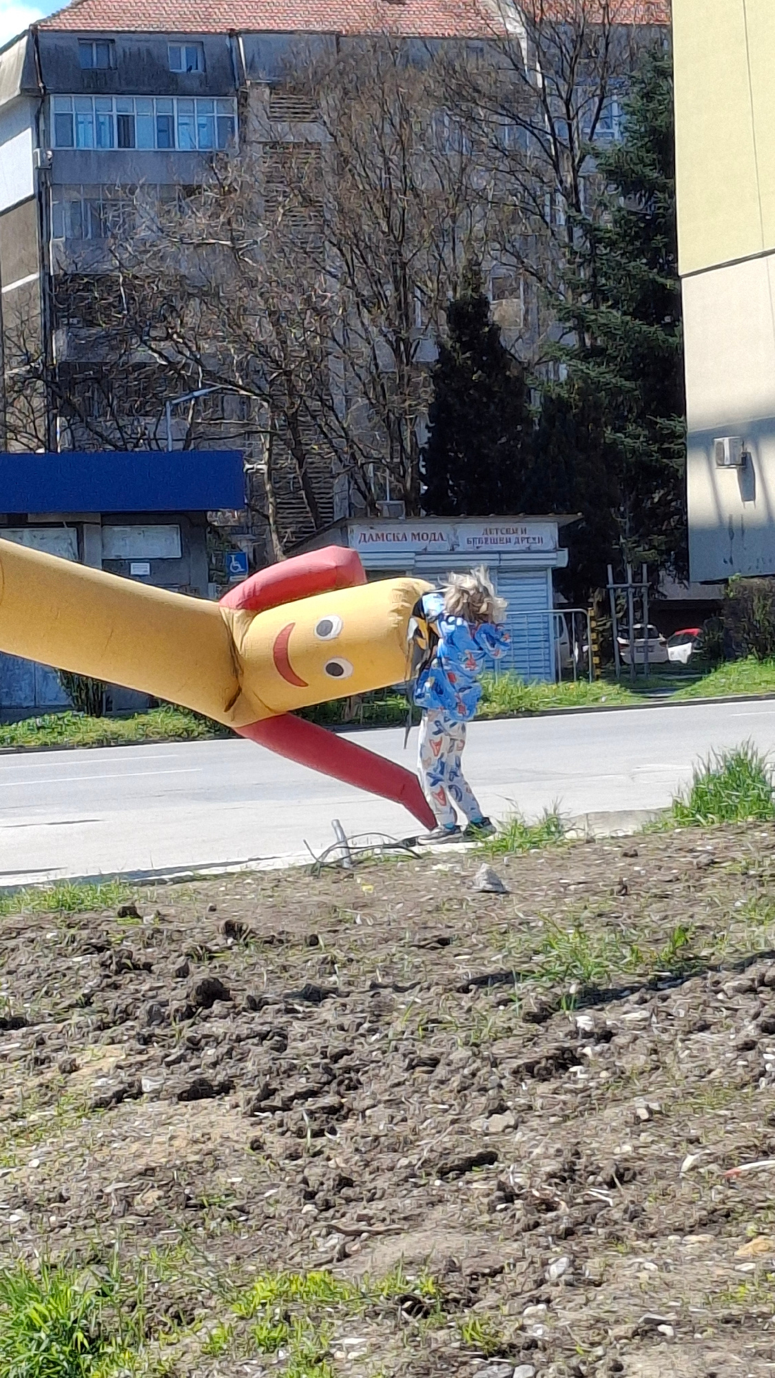 A child lies atop an inflated, yellow air dancer in Varna, Bulgaria. The air dancer has red "arms" and a smiling face. The child is wearing a blue and white patterned outfit. In the background are bui…read more