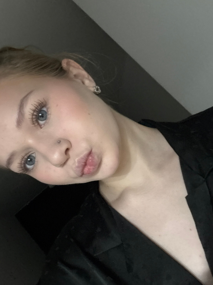 The image features a close-up, angled selfie of a young adult female. She has light-colored hair, blue eyes with enhanced eyelashes, rosy cheeks, and full lips puckered into a "kissing" expression. A…read more
