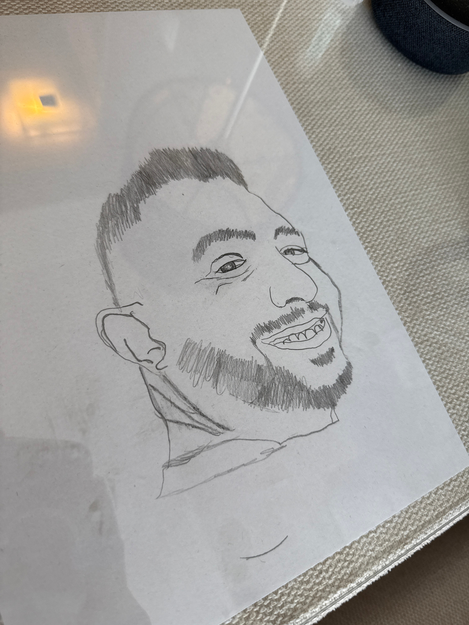 A pencil sketch of a man's face, likely middle-aged with a beard, is resting on a surface with a light-colored, textured material (possibly fabric). The face is angled, showing a slightly upturned per…read more