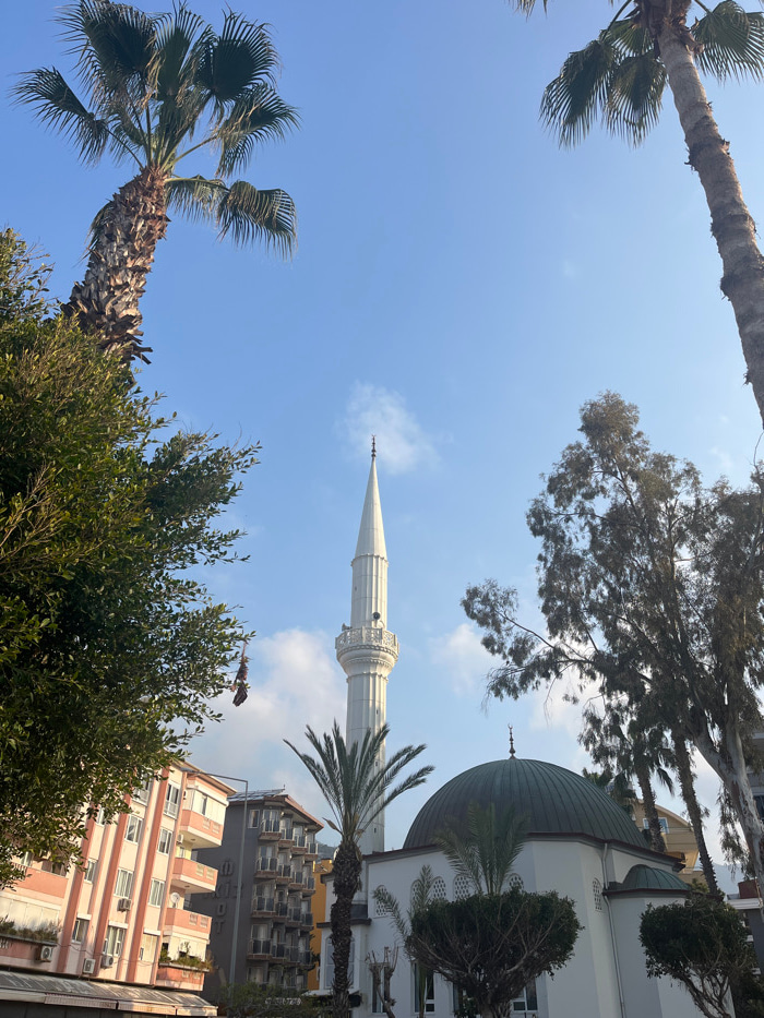 The image captures an exterior view of a mosque and its surrounding urban environment in Alanya, Turkey. The central subject is a white mosque building featuring a single, tall, slender minaret with a…read more